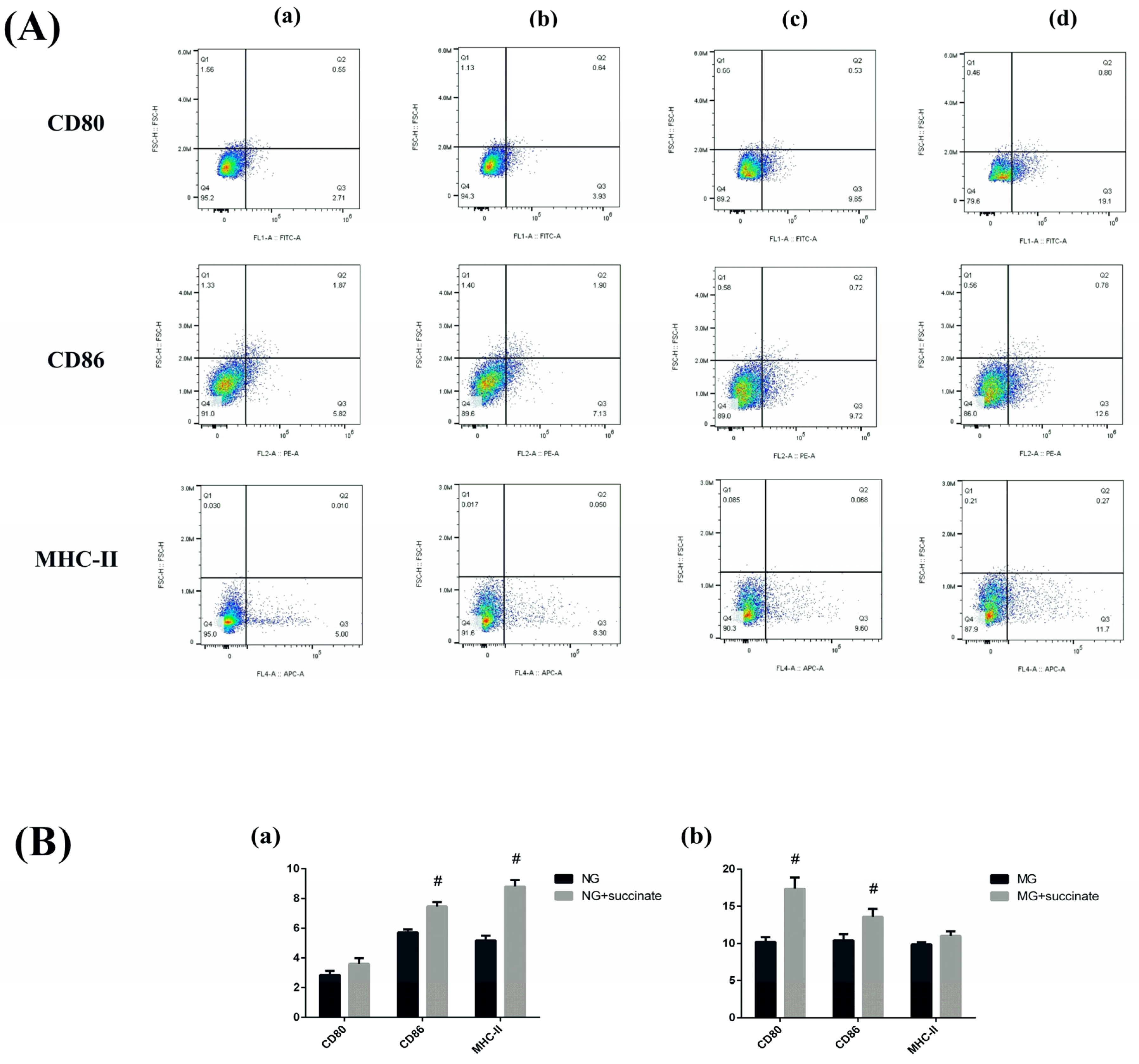 Figure 9. Effects of succinate on the immunophenotype of intestinal DCs ((A) Representative flow cytometry plots: (a) NG; (b) NG + succinate; (c) MG; (d) MG + succinate; (B) Effects of succinate intervention on CD80, CD86, and MHC-II expression in the NG (a) and MG (b)). Compared with the NG or MG, # p < 0.05. n = 6). Notes: NG, normal control group; MG, model control group; TPGs, total polysaccharide and glycoside treatment group.