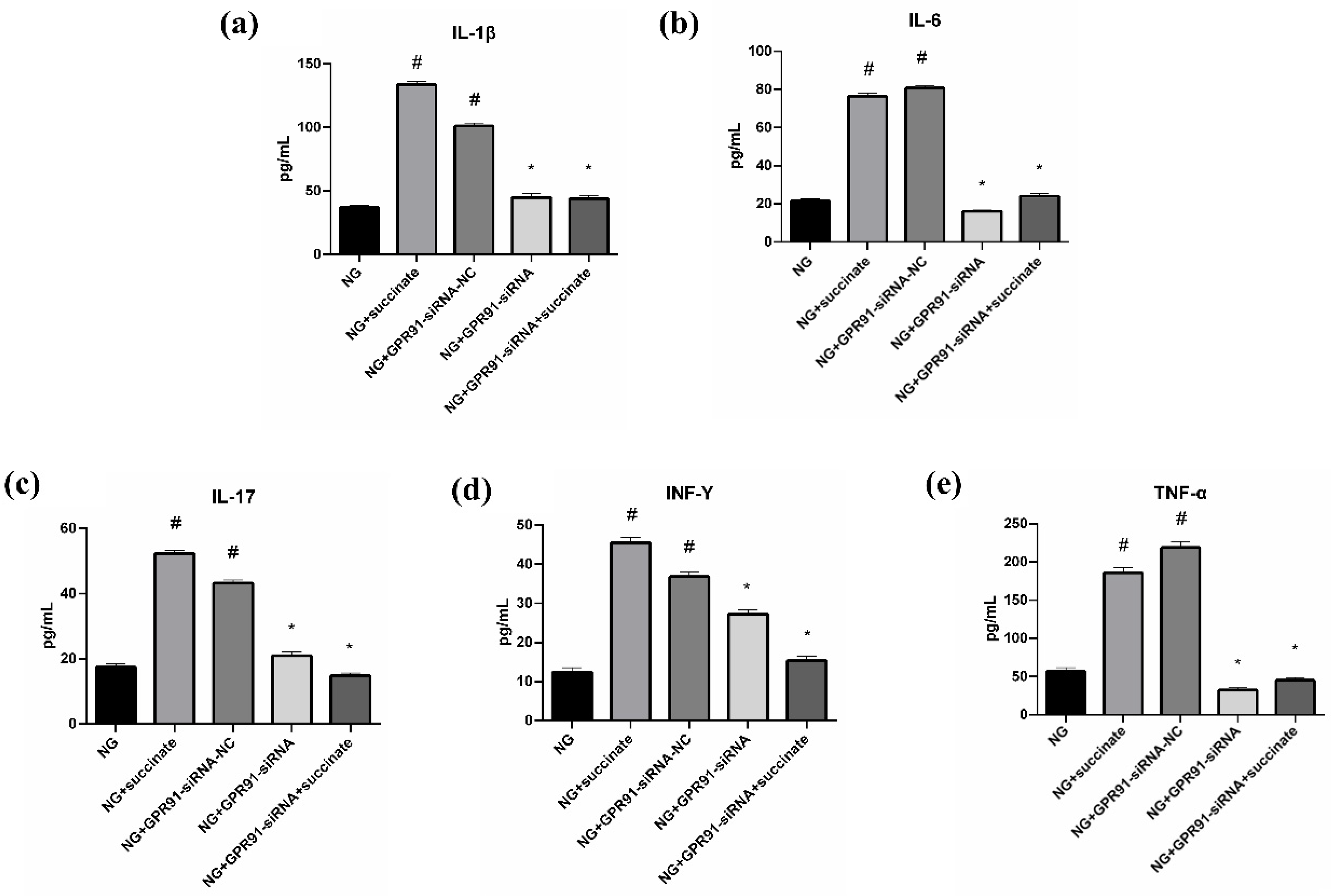 Figure 10. Succinate affects intestinal DCs through the receptor GPR91 ((a) IL-1β; (b) IL-6; (c) IL-17; (d) INF-γ; (e) TNF-α). Compared with the NG, # p < 0.05; compared with the NG + succinate, * p < 0.05, n = 6. Note: NG, normal control group.