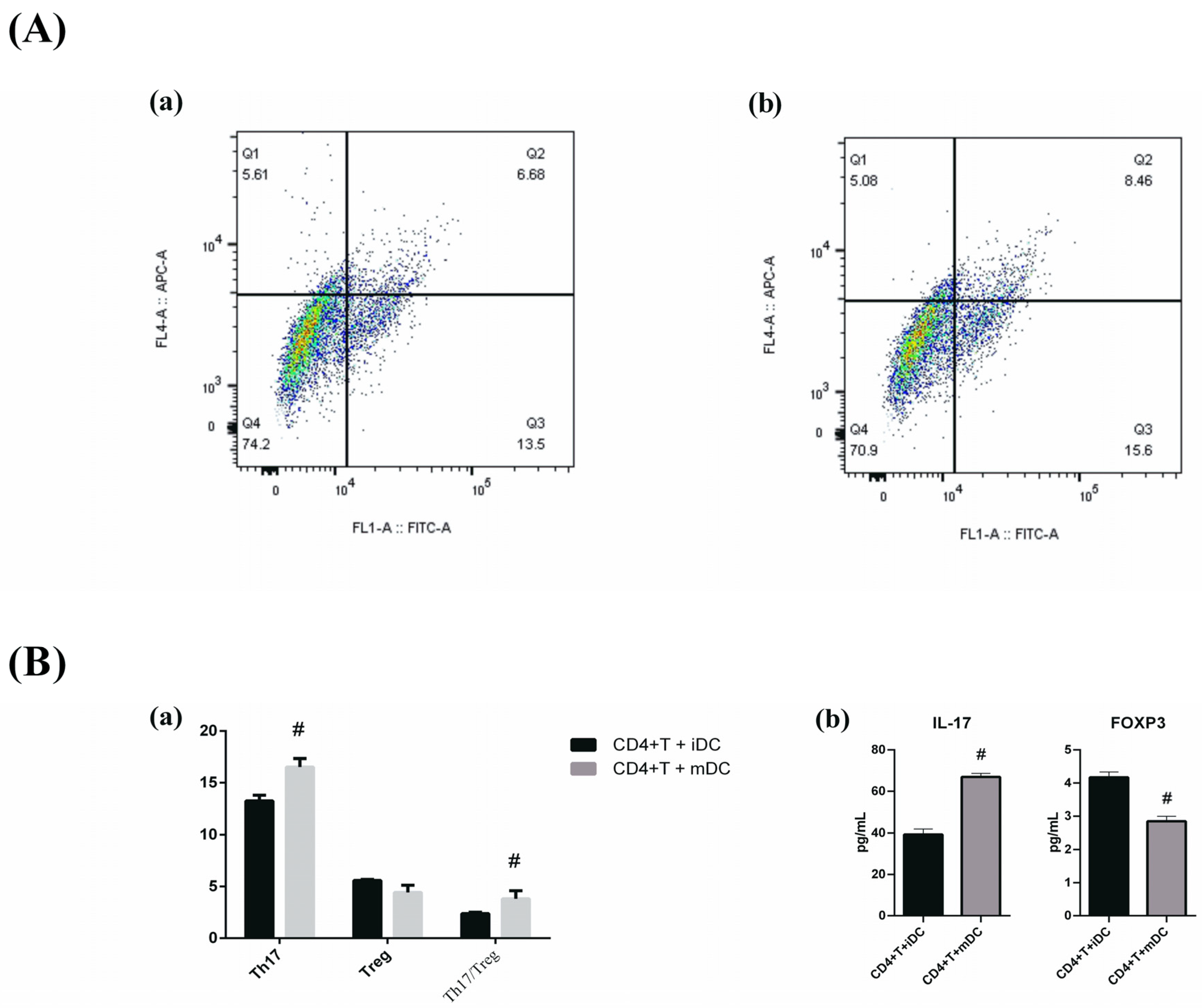 Figure 11. In vitro coculture of naïve T cells with two dendritic cell subsets (iDCs and mDCs) ((A) Representative flow cytometry plots of Th17 and Treg populations: (a) CD4+ T cells + iDCs; (b) CD4+ T cells + mDCs; (B) (a) percentages and ratios of Th17 and Treg cells; Specifically, the gray bars represent the CD4+ T cells + mDCs group, whereas the black bars represent the CD4+ T cells + iDCs group. (b) expression of Foxp3 and IL-17 in cell culture supernatants). Compared with CD4+ T cells + iDCs, # p < 0.05. n = 3.