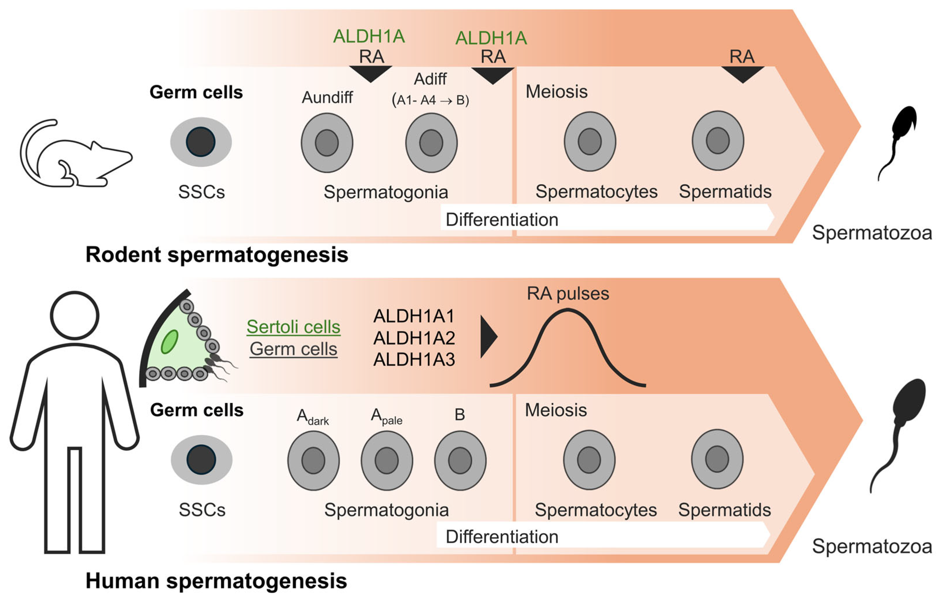 - Gewiss, R.; Topping, T.; Griswold, M.D. Cycles, Waves, and Pulses: Retinoic Acid and the Organization of Spermatogenesis. Andrology 2020, 8, 892–897. [Google Scholar] [CrossRef] [PubMed]