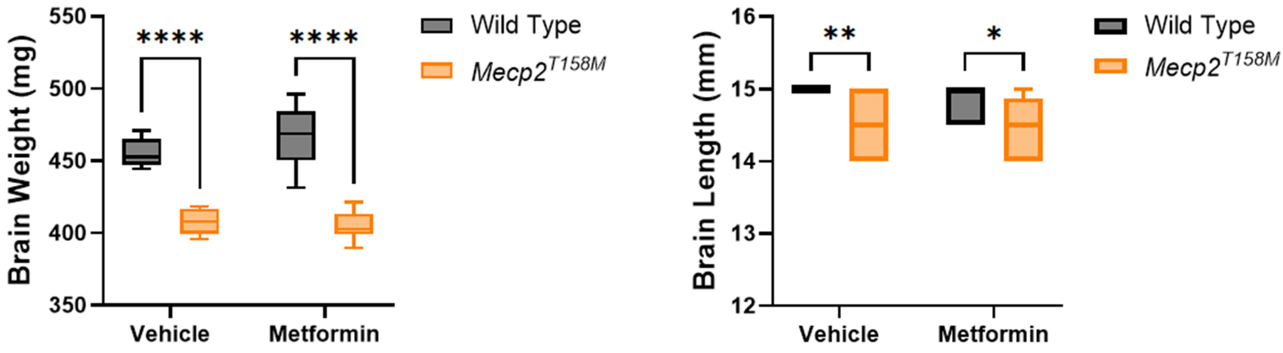 2.1. Metformin Did Not Alleviate Brain Size Deficits in the Hemizygous Male Mecp2T158M Mice