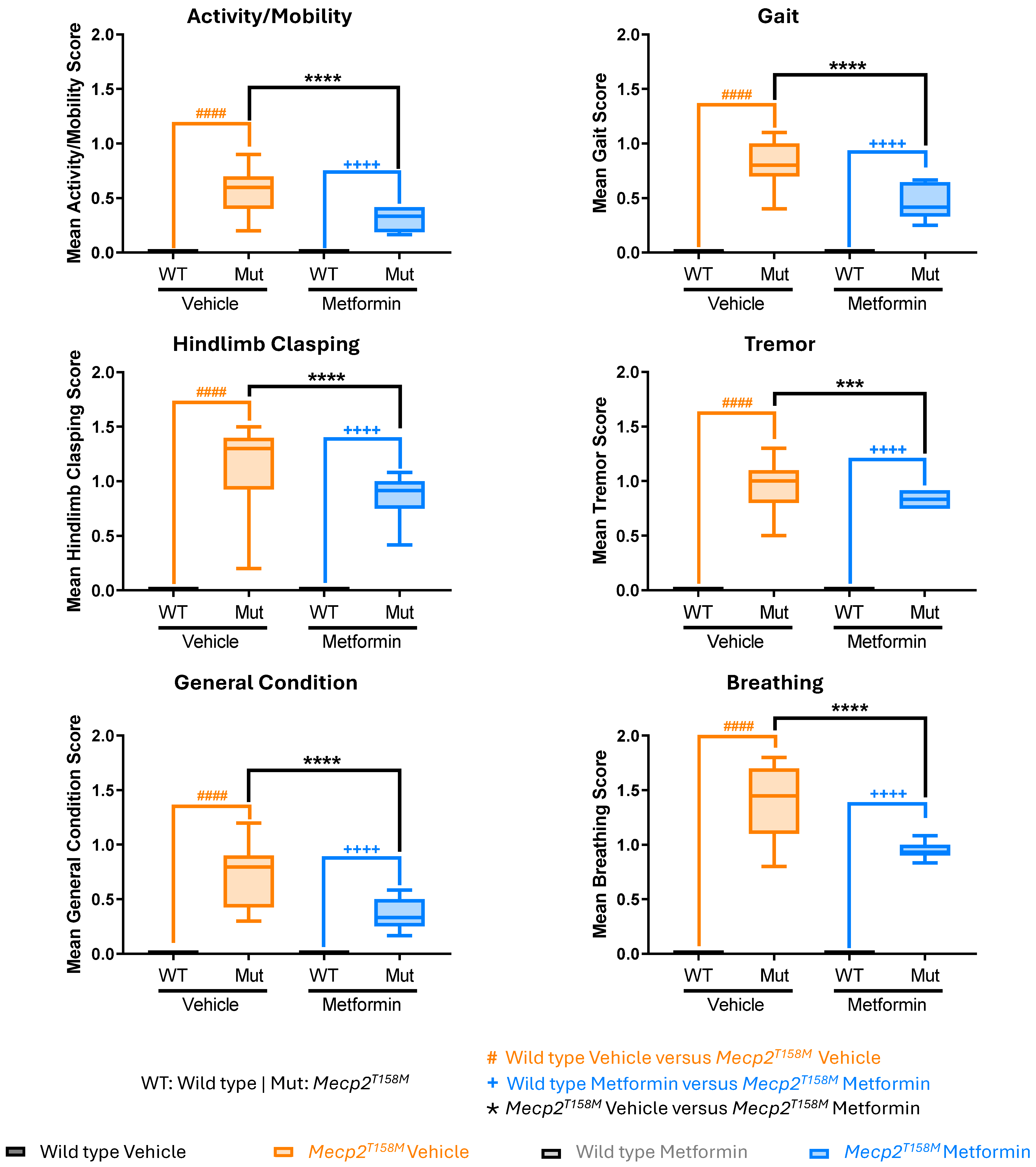 2.4. Metformin Treatment Had a Significant Positive Effect on the RTT-like Phenotypes in the Hemizygous Male Mecp2T158M Mice