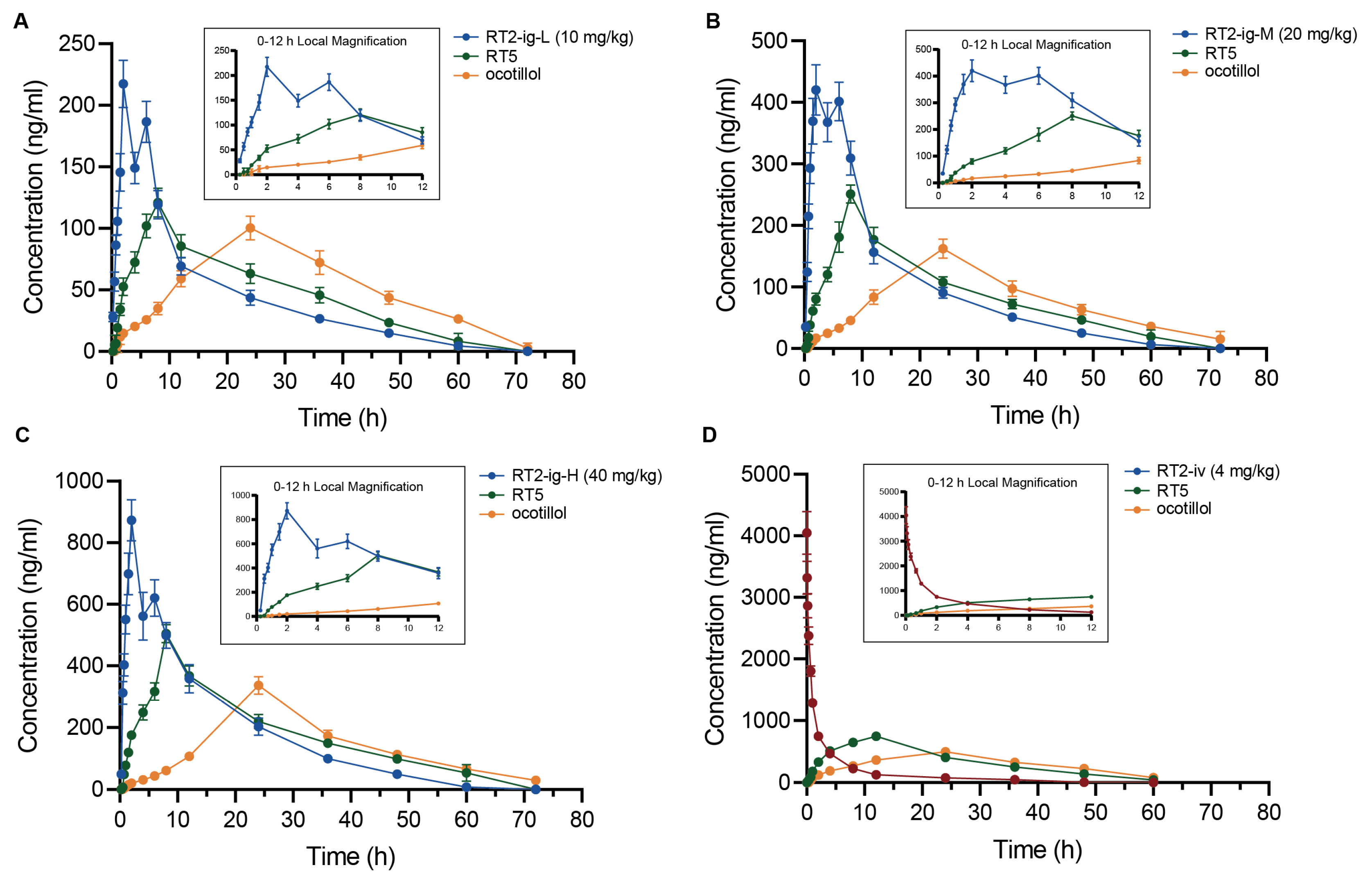 | Pharmacokinetic Parameters | RT2-ig-L (10 mg/kg) | RT2-ig-M (20 mg/kg) | RT2-ig-H (40 mg/kg) | RT2-iv (4 mg/kg) |