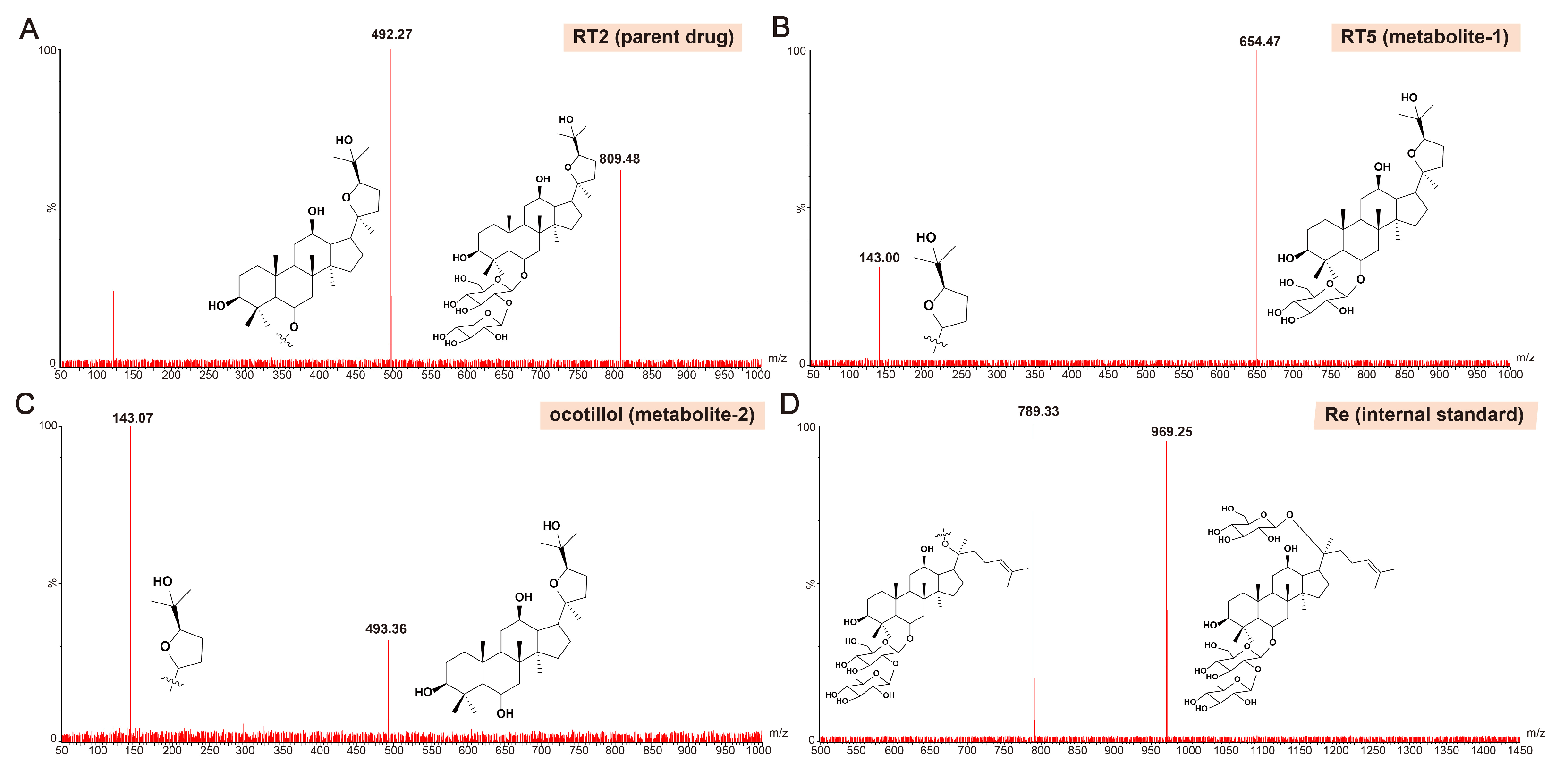 - Li, Y.Z.; Hu, H.; Li, Z.G.; Li, R.H.; Xu, F.; Zhao, C.Y.; An, Y.; Liu, Y.G.; Wang, Z.L.; Zhang, B.B.; et al. Pharmacokinetic Characterizations of Ginsenoside Ocotillol, RT5 and F11, the Promising Agents for Alzheimer’s Disease from American Ginseng, in Rats and Beagle Dogs. Pharmacology 2019, 104, 7–20. [Google Scholar] [CrossRef] [PubMed]