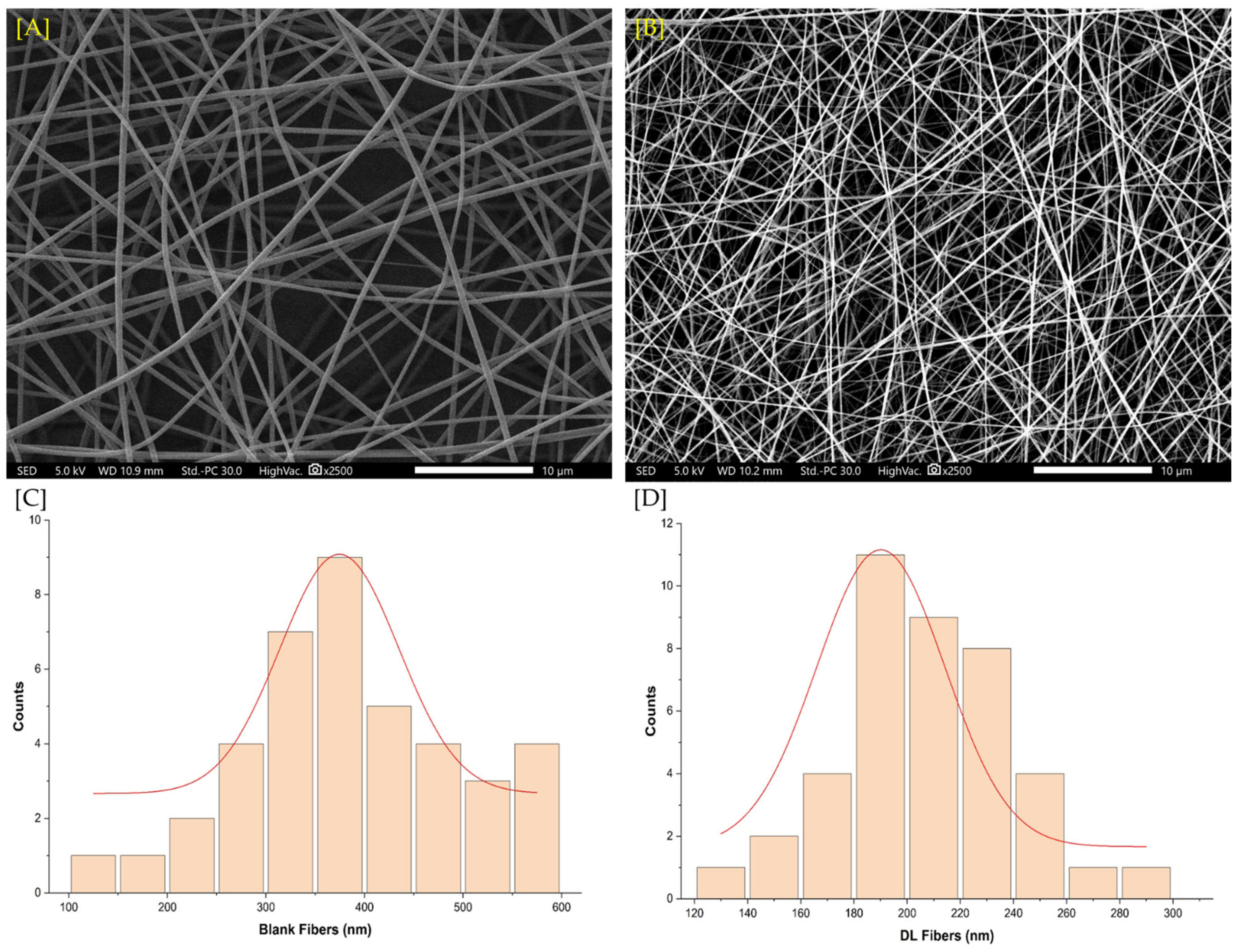 25]. The observed decrease in the fibers’ diameter for the drug-loaded nanofibers (218 ± 50 nm) compared to the blank fibers (458 ± 76 nm) might be due to the slight increase in the voltage to control the spinning jet, which in turn has reduced the diameter of the produced fibers, as shown in the previous studies [