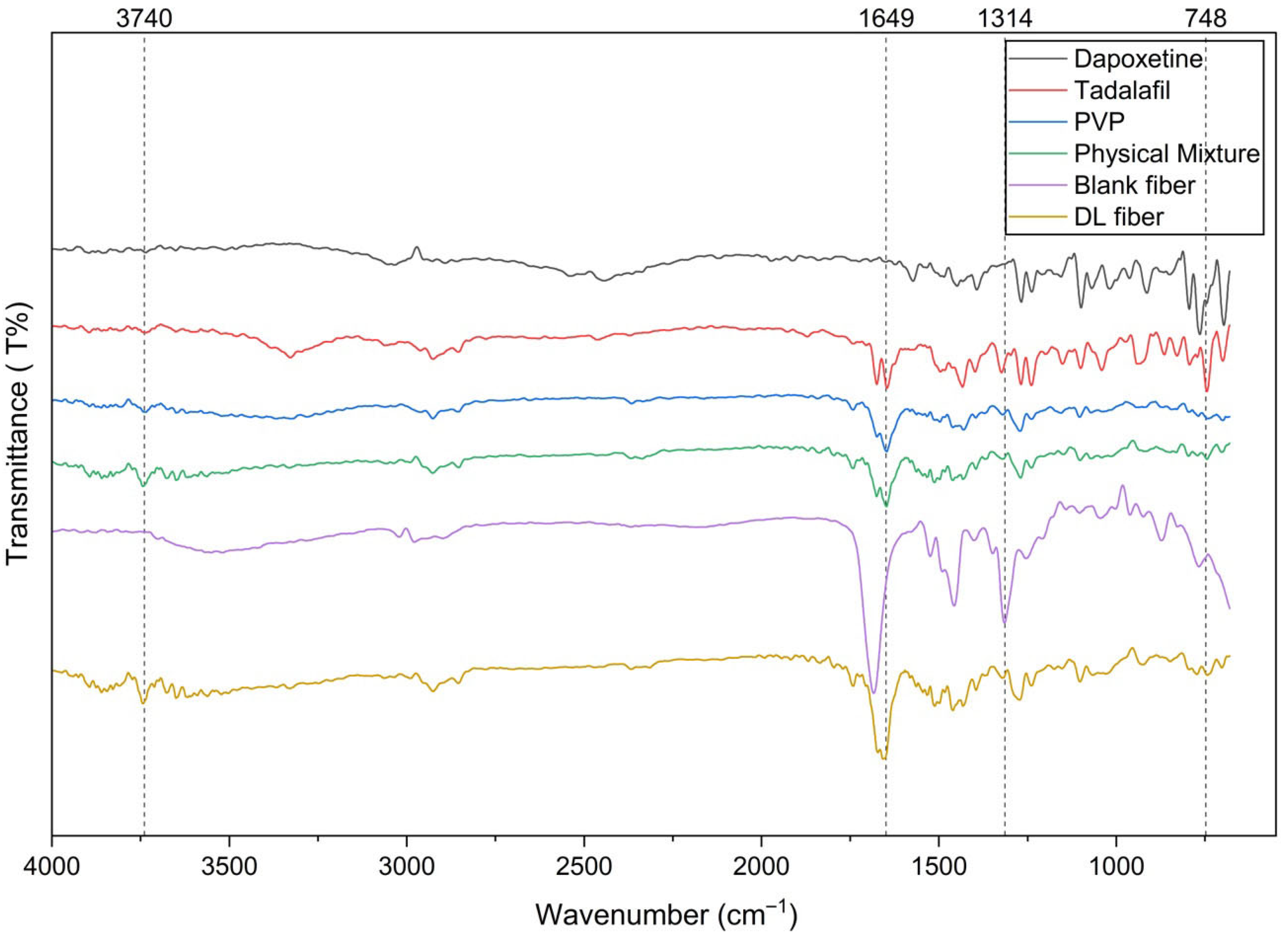 Fourier-Transform Infrared Spectroscopy (FTIR) analysis was performed using a Thermo Smart ATR IS20 Spectrometer (Thermo Fisher Scientific, Waltham, MA, USA) with a spectral resolution of 4 cm−1 and 32 scans per sample. Samples were analyzed within the wavenumber range of 4000 to 600 cm−1, including the tadalafil–dapoxetine-loaded PVP nanofibers, a physical mixture (PM) containing the same raw materials in powder form, and the blank nanofibers. Approximately 5 mg of each sample was used for analysis, and the FTIR spectra were plotted using OriginPro® 2021 software (OriginLab Corporation, Northampton, MA, USA).