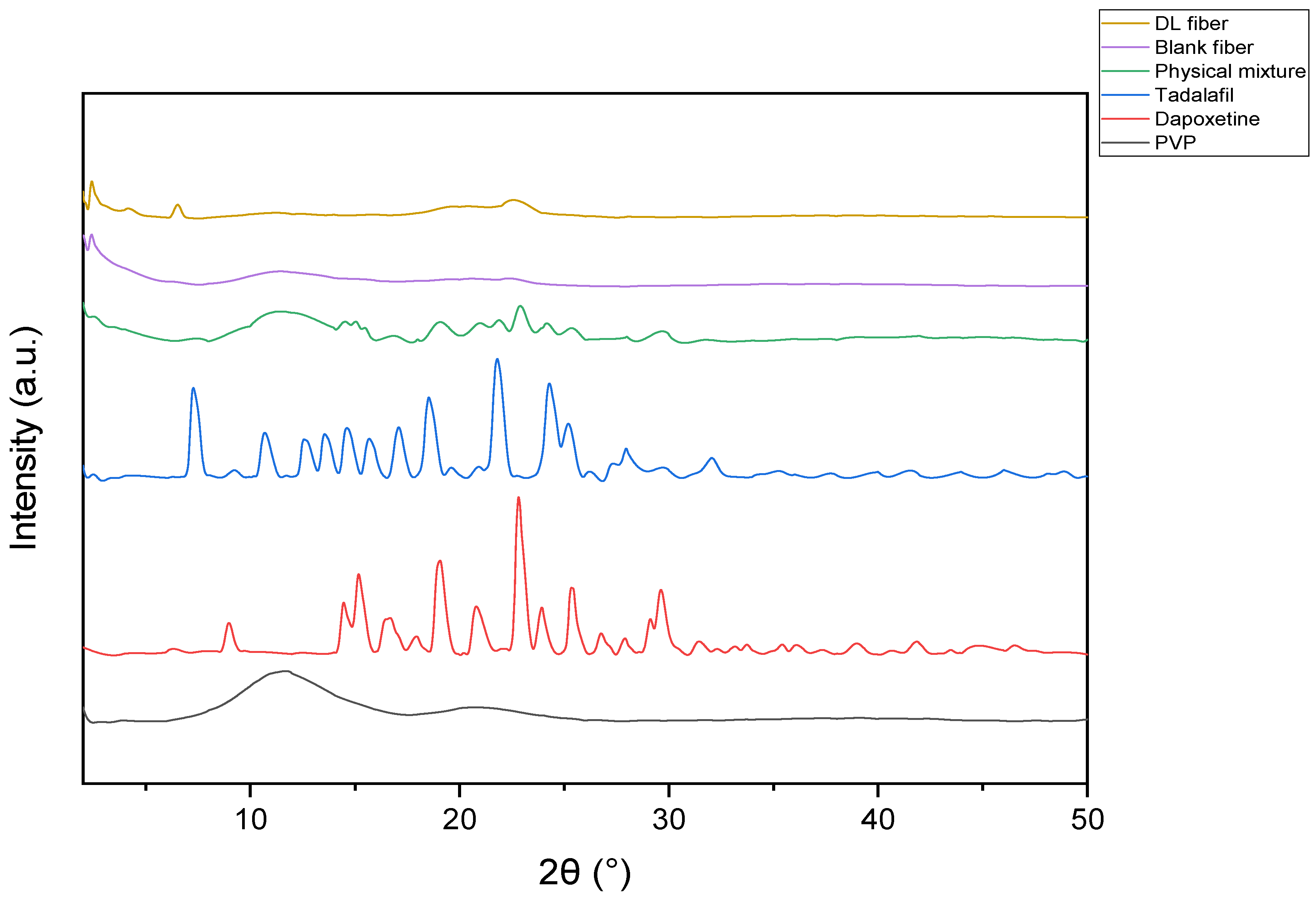 The XRD patterns provided further evidence of the crystalline nature of tadalafil and dapoxetine within the nanofibers. The appearance of sharp peaks for both drugs, along with broad-halo patterns for the blank fiber and PVP, confirms the presence of crystalline phases within the amorphous polymer matrix. These crystalline forms are essential for maintaining the drugs’ physicochemical stability and influencing their release kinetics. In particular, the XRD result for the dual-drug-loaded nanofibers demonstrated a low-intensity peak of tadalafil and dapoxetine, which might indicate their retention in the crystalline structures post-encapsulation, suggesting that the electrospinning process did not induce significant polymorphic transformations or degradation, which is critical for preserving their bioactivity [