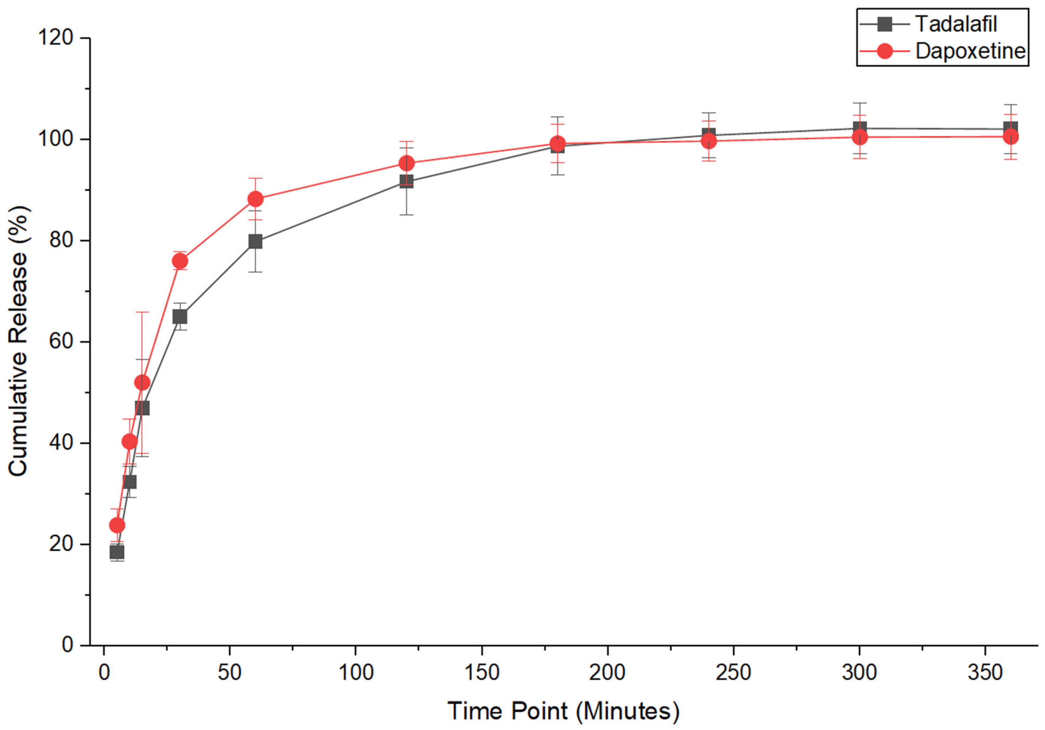 The release profiles of tadalafil and dapoxetine from the nanofibers were assessed using 20 ± 0.1 mg samples in 15 mL of a pre-warmed solvent mixture (20% PBS, pH 6.8, and 80% ethanol) in glass vials. This release medium was used to ensure complete dissolution of both drugs and to maintain sink conditions, rather than using a saliva-mimicking physiological medium. It was initially observed that 100% PBS exhibited noticeable turbidity and incomplete dissolution, largely due to the limited aqueous solubility of tadalafil [