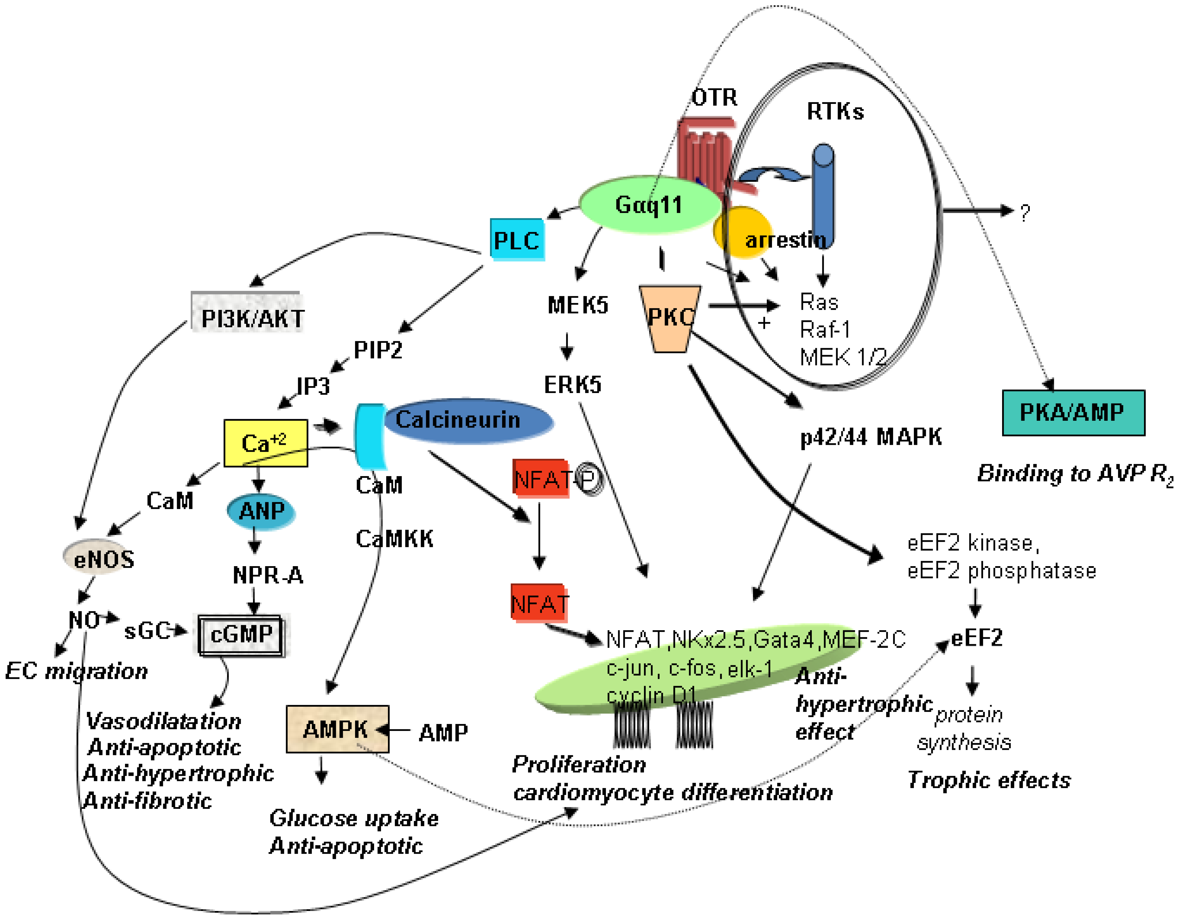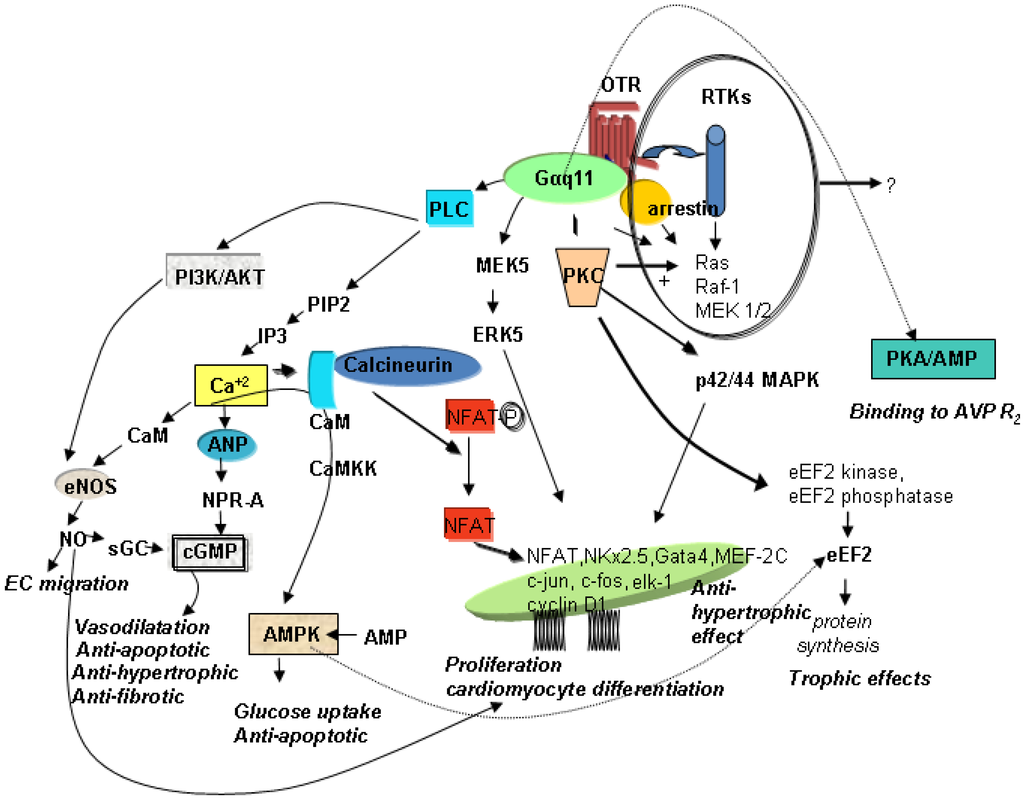 Schematic diagram of potential signalling pathways of OTR in CMs. AMPK—AMP—activated protein kinase; ANP—atrial natriuretic peptide; AVPR2—vasopressin receptor R2; CaM—calmodulin; CaMKK—Ca+2 calmodulin-dependent protein kinase; cGMP—cyclic guanosine monophosphate; CMs—cardiomyocytes; EC—endothelial cells; eEF2—eukaryotic translation elongation factor 2; eNOS—endothelial nitric oxide synthase; ERK—extracellular signal-regulated kinase; IP3—inositol triphosphate; MAPK−mitogen-activated protein kinases; MEK—MAPK/ERK; NFAT—nuclear factor of activated T-cells; NO—nitric oxide; NPR-A—natriuretic peptide receptor A; OTR—oxytocin receptor; PIP2—phosphatidylinositol 4,5-bisphosphate; PI3K—phosphatidyl-3 kinase; PKC—protein kinase C; PLC—phospholipase C; RTKs—receptor tyrosine kinases; sGC—soluble guanylyl cyclase.