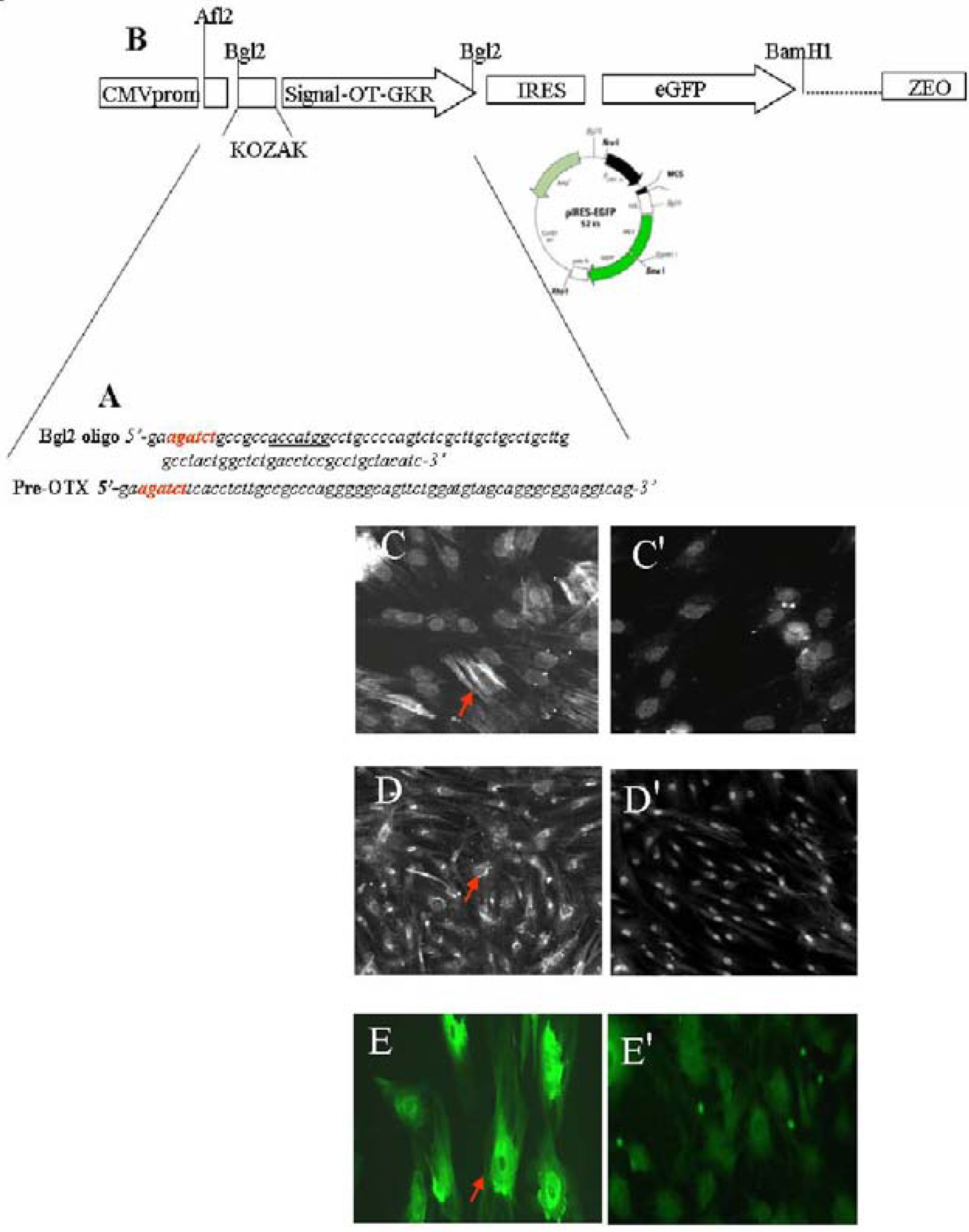 OT treatment of stem cells stimulates vascular cell markers. The sequence of oligonucleotides presented in (A) were used for: Construction of sites sensitive for restriction enzyme Bgl2 used for cloning (red); construction of consensus sequence for initiation of translation coding sequences (KOZAK, underlined) and, the generation of region coding OT-Gly-Lys-Arg (OT-GKR) oligopeptide. Oligonucleotide ligation, PCR amplification and molecular cloning in bacterial vector were performed in collaboration with Dr. Dominic Devost and Dr. Hans H. Zingg, McGill University. (B) The construct was introduced into internal ribosome entry site (IRES) vector containing the cytomegalovirus (CMV) promoter, the green fluorescence protein (eGFP) sequence and zeomycin resistance gene. This construct was employed for transfection of human mesenchymal cells. For transfection, 2 µg plasmid DNA was mixed with FuGENE 6 Transfection Reagent (Roche Diagnostics, Indianapolis, IN, USA: Cat. No. 11 815 091 001) according to the manufacturer’s specifications. Cells expressing OT-GKR protein produced smooth muscle actin (C) and vascular endothelial growth factor (D), as detected by immunofluorescence. Control mesenchymal cells transfected with the vector were negative (C' and D', respectively). Vascular endothelial growth factor production was also stimulated by OT treatment of stem cell fractions isolated from the rat heart as side population (E), compared to non-treated controls (E').
