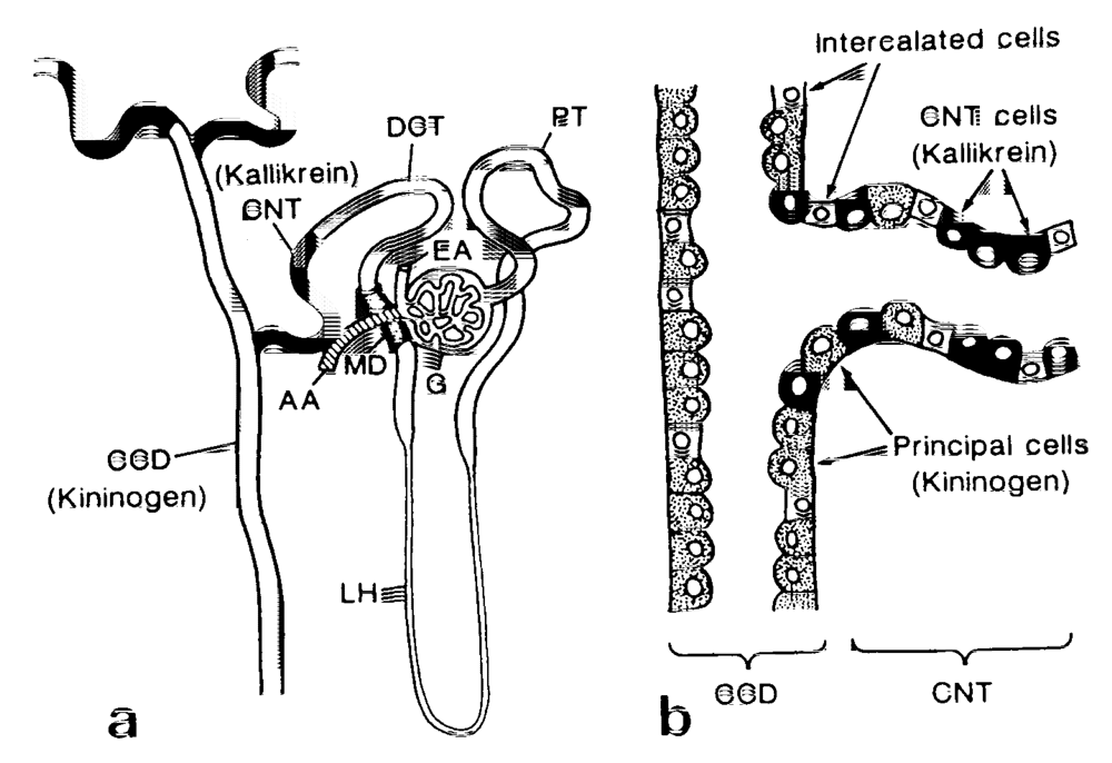 (a) Diagram of the immunocytochemical localization of kallikrein and kininogen in the human nephron and (b) a schematic representation of the intermingled CNT cells and principal cells at the junction between CNT and CCD. AA, afferent arteriole; CCD, cortical collecting duct; CNT, connecting tubule; DCT, distal convoluted tubules; EA, efferent arteriole; G, glomerulus; MD, macula densa; LH, Loop of Henle: PT, proximal tubule. (reproduced from Ref. [13] with permission).
