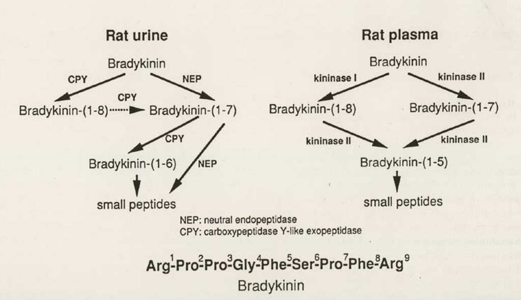 It is most characteristic that the degradation pathway of BK by kininases (kinin-destroying enzymes) in the collecting tubules of the kidney and in urine is completely different from that in plasma. Degradation of BK in urine is not inhibited by ACE inhibitors. As shown in Figure 2, we analyzed the pathway of BK degradation by rat and human urine and found that the major kininases in human and rat urine are carboxypeptidase-Y-like exopeptidase (CPY) and neutral endopeptidase (NEP) [33]. Carboxypeptidase Y was originally found in yeast. This enzyme activity in rat urine was identified by the inhibitor spectrum and an antibody against a peptide fragment, but unfortunately the total structure could not be determined because of the small quantity of rat urine, so it is tentatively designated carboxypeptidase Y-like exopeptidase (CPY) [33].