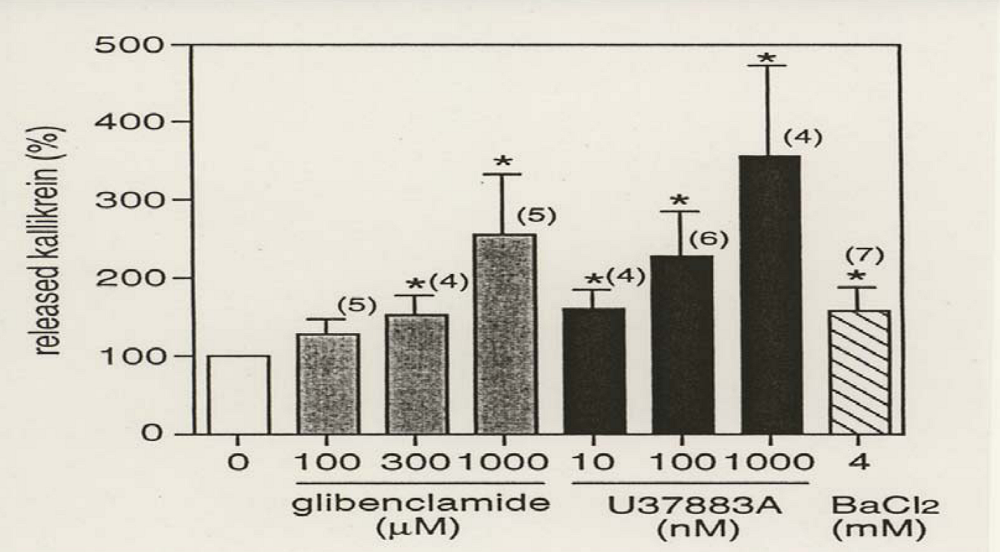 The above observation was also confirmed by in vitro experiments. Glibenclamide (0.1 to 1 mM) and PNU-37883A (0.01 to 1 μM) induced a concentration–dependent release of renal kallikrein from the slices of rat kidney cortex [68] (Figure 3). The KATP channels of the cortical CD in the kidney may be slightly different from the β-cells of the pancreas, because PNU-37883A is selective to the CNT cells and 1,000 times more potent than glibenclamide. Barium chloride, which inhibits intracellular potassium efflux by blocking the channels, also showed increase in the kallikrein release. The renal kallikrein release from the slice by high potassium concentrations or KATP channel blockers was reduced by the absence of calcium or in the presence of a voltage-dependent calcium channel blocker, nifedipine, in the superfused solution [68]. The renal kallikrein release was inhibited by cytochalasin B, indicating that the exocytosis of renal kallikrein is induced by polymerization of actins.
