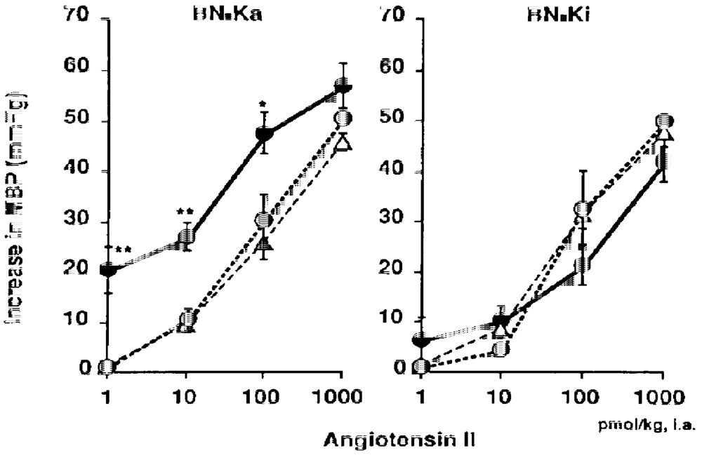 Mice that are homozygous for the targeted disruption of the gene encoding BK-B2 receptor (B2-KO) have been reported [114]. They lack responses in the ileum, uterus, and the superior cervical ganglion to BK. BK-B1- and B2-KO mice are normotensive, but exhibit a lower heart rate than controls [115]. In contrast, B2-KO mice have a greater pressure response to the chronic high sodium intake than controls do [116]. The mean blood pressure of B2-KO mice, maintained on a high Na+ diet (3.15% in food + 1% saline in drinking water) for eight weeks, was higher (114 ± 6 mmHg), than 79 ± 2.8 mmHg seen in B2-KO mice on a normal Na+ diet. Renal blood flow was reduced by 20% and renal vascular resistance was twice that of B2-KO mice on normal Na+. Control mice on high Na+ were normotensive and tended to have increased renal blood blow and decreased renal resistance, compared with control mice on a normal Na+ diet [117]. In another report [118], BK2R-/- mice showed a slightly higher blood pressure than wild-type BK2R(+/+) and BK2R(+/-) mice. Chronic salt loading (0.84 mmol/g chow for 15 days) increased the blood pressures of BK2R(-/-) and BK2R(+/-), whereas it did not affect BK2R(+/+) mice.
