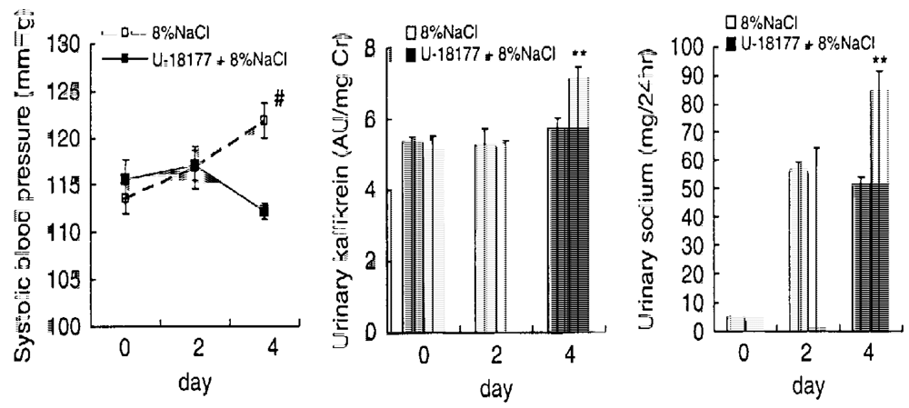 In human subjects, it was reported that a relationship was observed between kallikrein and sodium in urine [50]. However, the further clinical studies revealed no direct correlation between urinary sodium and kallikrein excretion in a large population of normal adults [51] or in hypertensive adults [52]. A positive correlation between urinary kallikrein and sodium was also not found in over 600 normal children over 5-year period [53]. This inconsistency may have arisen because the subjects were free to choose their diets, and there was no restriction on the contents of sodium and potassium or the volume of fluid that could be consumed. Thus, the effects of high sodium intake on urinary kallikrein excretion are controversial.