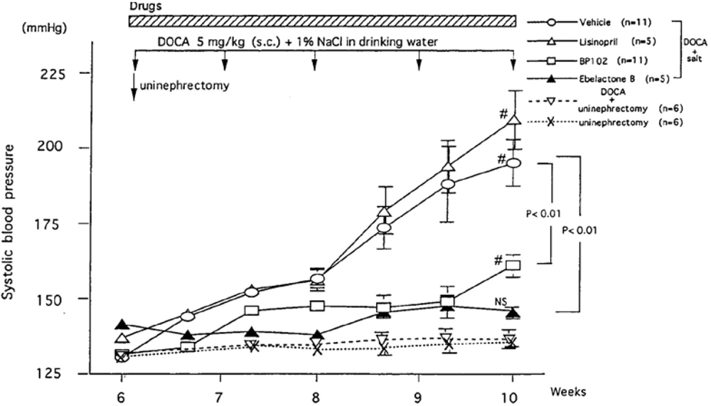 - Ito, H.; Majima, M.; Nakajima, S.; Hayashi, I.; Katori, M.; Izumi, T. Effect of prolonged administration of a urinary kininase inhibitor, ebelactone B on the development of deoxycorticosterone acetate-salt hypertension in rats. Br. J. Pharmacol. 1999, 126, 613–620. [Google Scholar] [CrossRef] [PubMed]