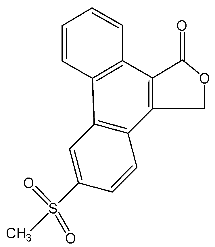 Compound I resulted from two methods, recrystallisation and co-precipitation. In the recrystallisation experiment 10 mg of rofecoxib was dissolved in 2 mL of ethyl acetate and stirred at 65 °C for 15 min. For the co-precipitation experiment 10 mg of rofecoxib was stirred in 2 mL 10% HPβCD (hydroxypropyl-β-cyclodextrin) solution at 60 °C for 72 h. All solutions were exposed to room light intensity. The resultant solution was thereafter filtered and left to evaporate at room temperature. Crystal formed after one month. After testing, the product was identified as 6-methyl- sulphonylphenanthro-[9,10-C]-furan-1(3H)-one (I) [8] (Figure 3).