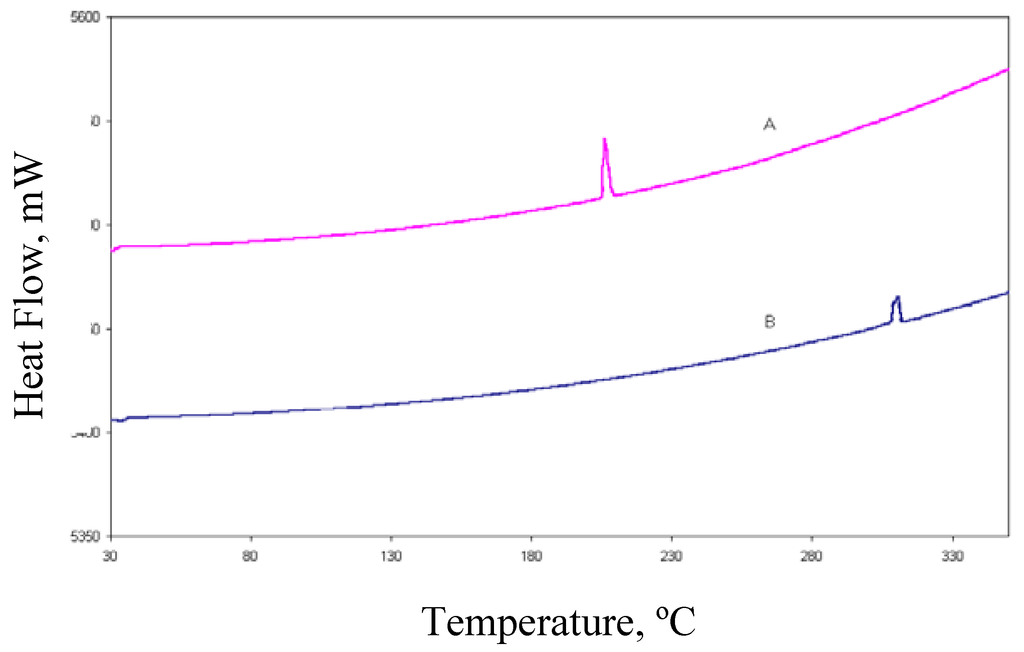 DSC (differential scanning calorimetry) analysis revealed that rofecoxib exhibited a fusion endotherm (Figure 4) at onset temperature 209.3 °C (ΔHf = 125.0 J/g). Compound I also exhibited a single fusion endotherm but at the different onset temperature of 307.1 °C (ΔHf = 48.5 J/g) thereby implying that these are two different chemical species. TGA (thermogravimetric analysis) proved that both forms were free of solvent since there was a zero mass loss in the temperature range 30 °C–350 °C.