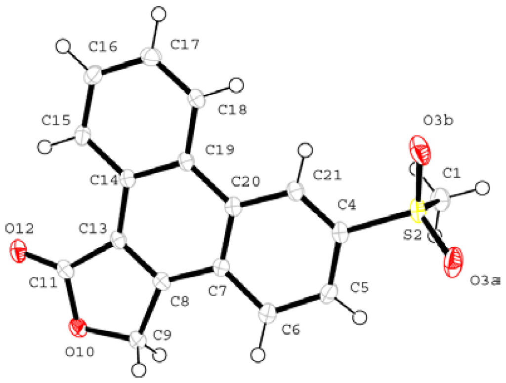 A recent non-steroidal anti-inflammatory drug used between 1999 and 2004 is rofecoxib [4-(4-methylsulphonylphenyl)-3-phenyl-2,5-dihydro-2-furanone, Vioxx®, Figure 2]. Rofecoxib is a Cox-2 inhibitor belonging to the diaryl substituted furanones. Rofecoxib has been used for the treatment of osteoarthritis, primary dysmenorrhoea and acute pain [3]. However, its effectiveness may be reduced due to its low solubility in water (~0.0086 mg/mL at 25 °C) and limited dissolution rate [4]. Therefore, to combat this problem different solid forms were pursued that might show superior solubility behaviour. However, in the attempt to discover a new polymorph, an unexpected product was obtained. This product, 6-methylsulphonylphenanthro-[9,10-C]-furan-1(3H)-one (I), resulted from two methods, recrystallisation and co-precipitation. Compound I has been previously reported in the literature, where its existence was mainly identified by standard chromatographic methods [5,6,7]. In these reports the degradation product was easily obtained by exposing a solution of rofecoxib-acetontrile or rofecoxib-acetonitrile/water to UV light. Herein, we report for the first time the existence and identification of I via standard crystallographic techniques.