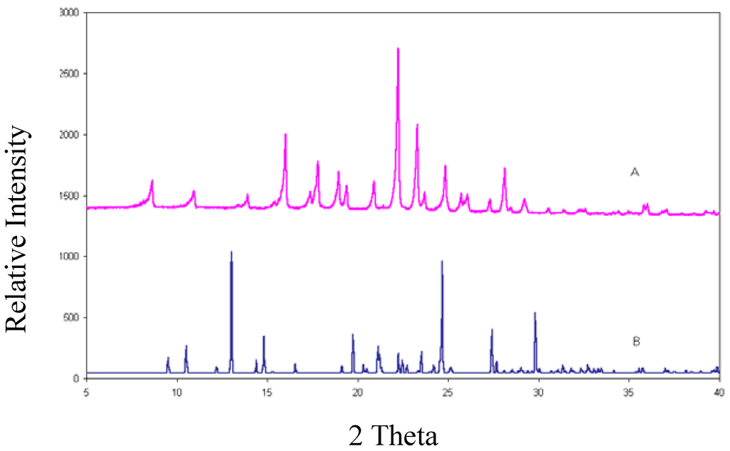 This is the most informative technique to establish whether a new crystalline phase has been created. If the XRPD (X-ray powder diffraction) trace of the material investigated differs from that of the reference material this implies that either a new polymorph has been formed or a chemical transformation has taken place. The XRPD trace (Figure 7) of rofecoxib is compared with the Lazy Pulverix [10] calculated trace for I. The completely different traces verify that a new crystal phase had indeed been created.