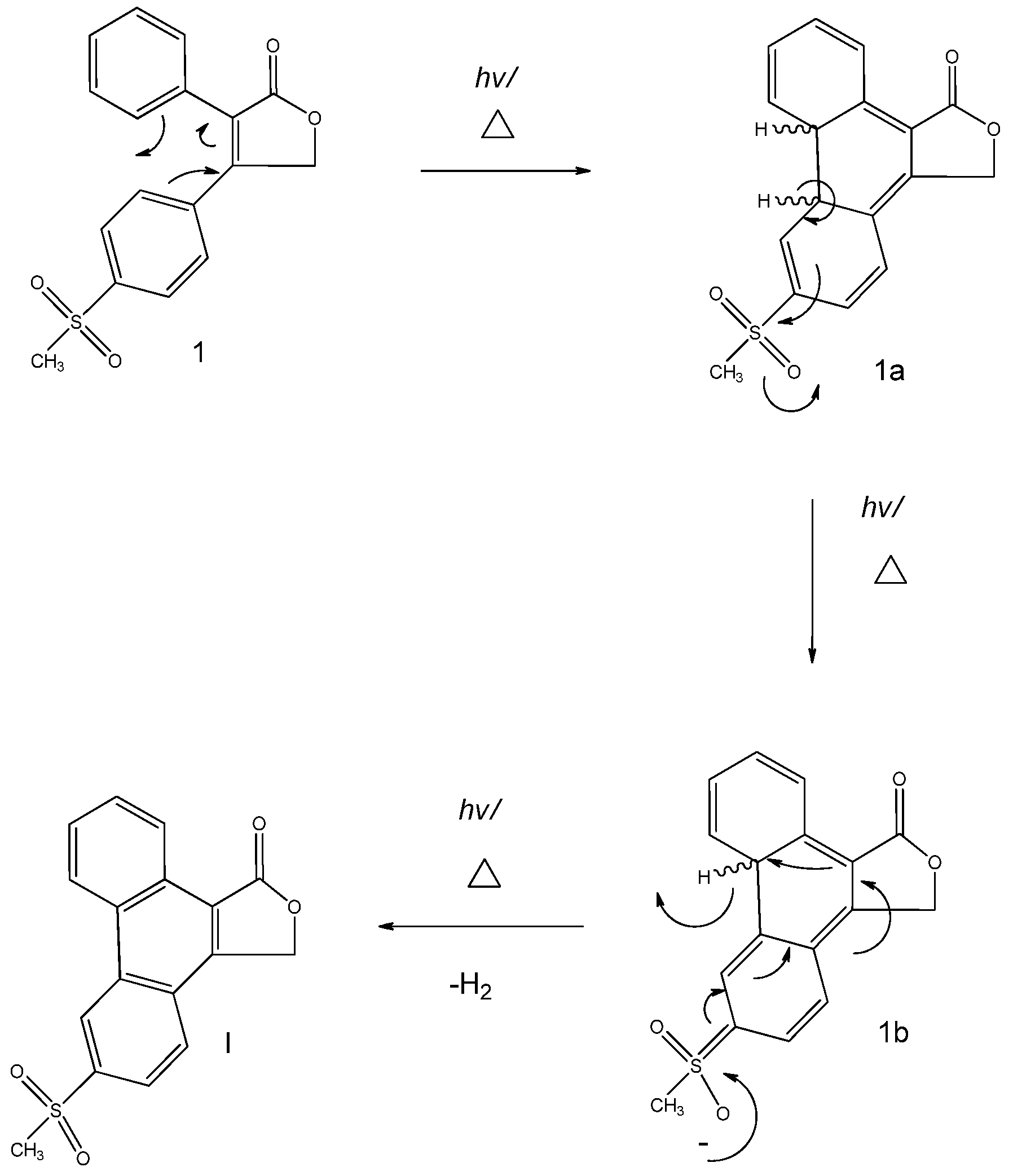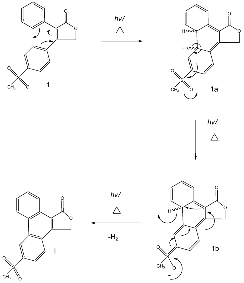 However, the literature suggests that this is a photo-cyclization (light induced) product, implying that this has a conrotatory bond outcome [12,13,14]. The complimentary reaction that takes place thereafter is dehydrogenation via oxidation (1a and 1b) ultimately forming the product I. The excellent anion-stabilising sulphone group provides the driving force behind aromatisation. This substituent is highly electron-withdrawing thereby promoting dehydrogenation. High temperatures favours dehydrogenation as the high activation energy required for this process is overcome by high temperatures. High temperatures also favour elimination by increasing the entropy in the free energy of the reaction. It could be tentatively hypothesized that the solvent could be acting as a poor nucleophile in aiding the primary dehydrogenation. Only the degradation product of rofecoxib, 6-methylsulphonyl- phenanthro-[9,10-C]-furan-1(3H)-one, was encountered in attempts to generate new forms of the drug. Nevertheless, strenuous stress trials conducted by Mao et al. [8] revealed that two major side-products may form. One of which results from the base promoted hydrolysis of the lactone moiety followed by oxidation, which yields a dicarboxylate; the other results from photo-cyclization of the cis-stilbene moiety which results in a phenanthrene derivative. In this investigation, the latter product was produced.