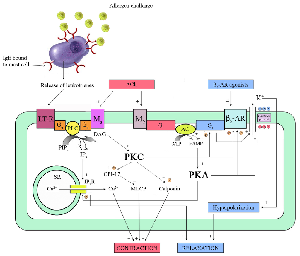 Mechanisms of relaxation and β2-adrenoceptor (β2-AR) desensitization in airway smooth muscle (ASM). The binding of a specific agonist to β2-AR stimulates the receptor-coupled Gs-protein, which activates adenylyl cyclase (AC). The resulting increase of cyclic 3',5'-adenosine monophosphate (cAMP) activates protein kinase A (PKA), which phosphorylates inositol 1,4,5-trisphosphate receptor (IP3R) of sarcoplasmic reticulum (SR) and opens Ca2+-activated K+ (BKCa) channels, thus leading to relaxation. However, activated PKA phosphorylates β2-AR, uncoupling it from Gs-protein. Exposure of sensitized mast-cells to allergen causes release of leukotrienes (LT). Their interaction with the specific receptor, i.e., LT-R, activates a Gq-protein, which increases phospholipase C (PLC) activity. PLC catalyzes the hydrolysis of phosphatidylinositol 4,5-bisphosphate (PIP2), which produces IP3 and diacylglycerol (DAG). IP3 leads to contraction by increasing release of Ca2+ from SR while DAG activates protein kinase C (PKC). The latter phosphorylates several substrates like calponin and CPI-17, which is an inhibitor of myosin-light-chain phosphatase (MLCP). In addition, PKC phosphorylates both β2-AR and Gs-protein. A similar cascade of events seems to occur in response to acetylcholine (ACh) released by cholinergic nerves through M3-muscarinic receptors. In addition, activation of M2-muscarinic receptors inhibits AC, thus decreasing cAMP level and PKA activity. ATP: adenosine trisphosphate;