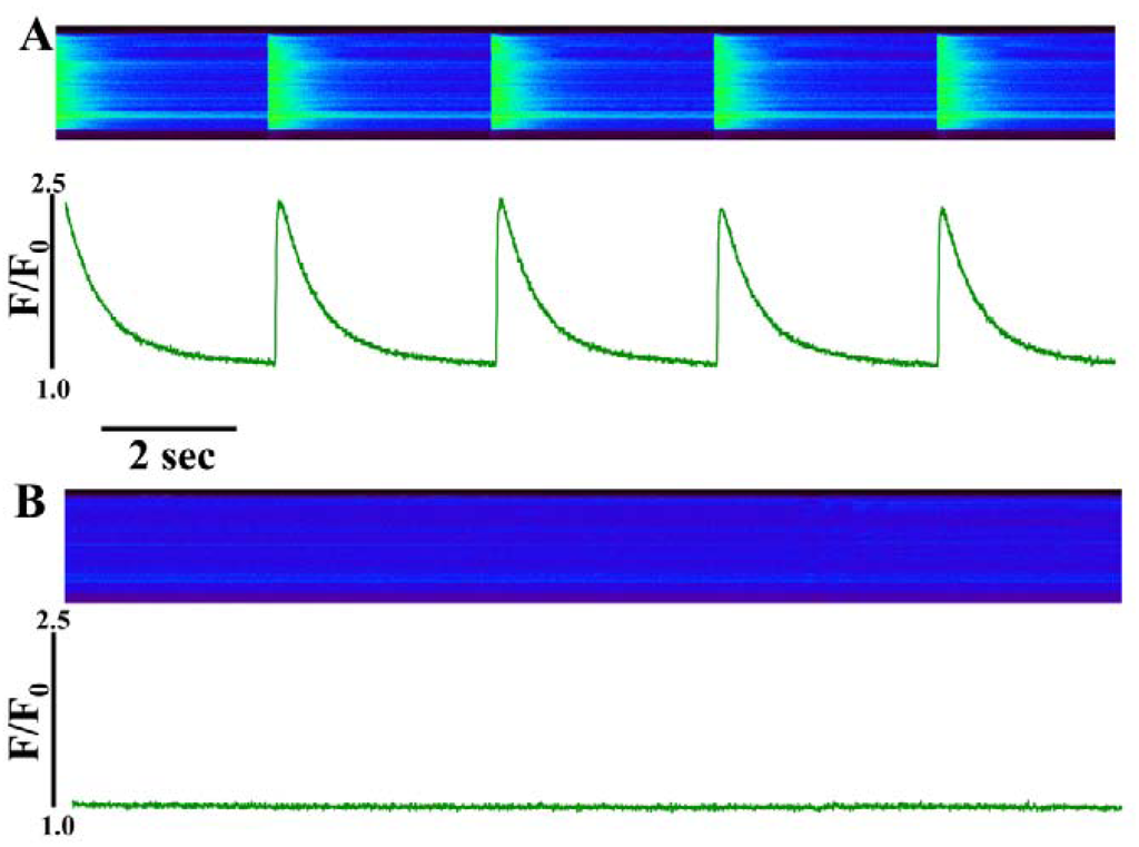 Perfusion of intact ventricular cardiomyocytes with a high concentration (30 µM) of IpTxa causes immediate cessation of [Ca2+]i transients. (A) line-scan image (top) and associated fluorescence plot (bottom) of a field-stimulated mouse ventricular cardiomyocyte loaded with the Ca2+ indicator Fluo-4 and perfused constantly with normal Tyrodes solution in the absence of IpTxa (control). (B) The same cell ~1 min after perfusion with the same Tyrodes solution, but containing 30 µM IpTxa. The protocol was repeated four times and the result below is representative of three experiments.