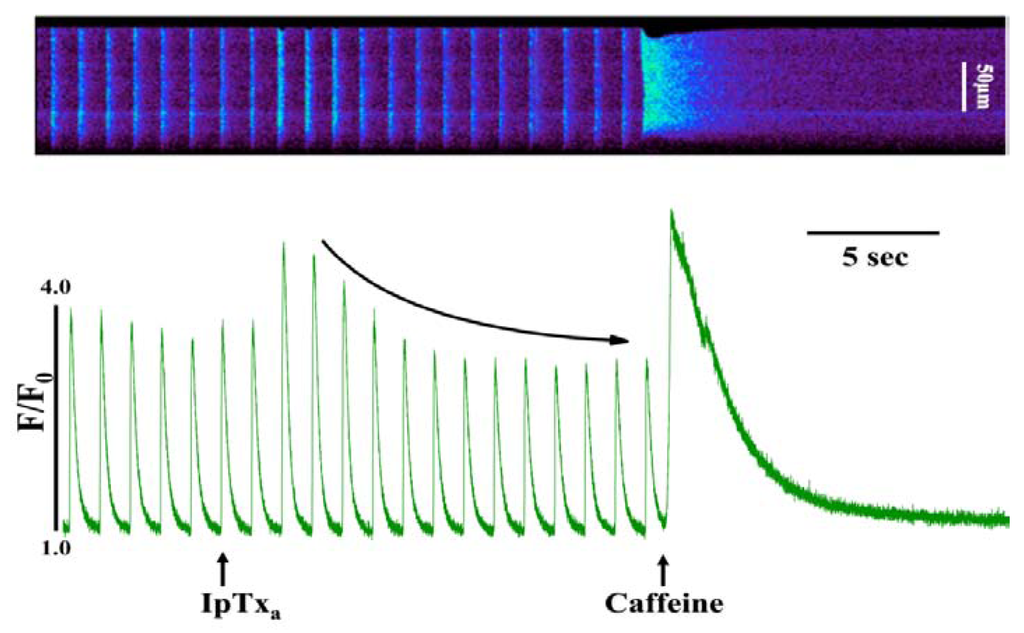 Perfusing intact cardiomyocytes with 100 nM IpTxa produced an increase in the amplitude of the [Ca2+]i transient followed by a gradual decrease to a new steady-state. Line-scan image (top) and associated fluorescence plot (bottom) of a field-stimulated mouse ventricular cardiomyocyte loaded with the Ca2+ indicator Fluo-4 and perfused constantly with normal Tyrodes solution in the absence of IpTxa. At the time indicated by the arrow, IpTxa (100 nM) or caffeine (10 mM) was perfused onto the cell. The protocol was repeated 36 times and the result below is representative of 12 experiments.