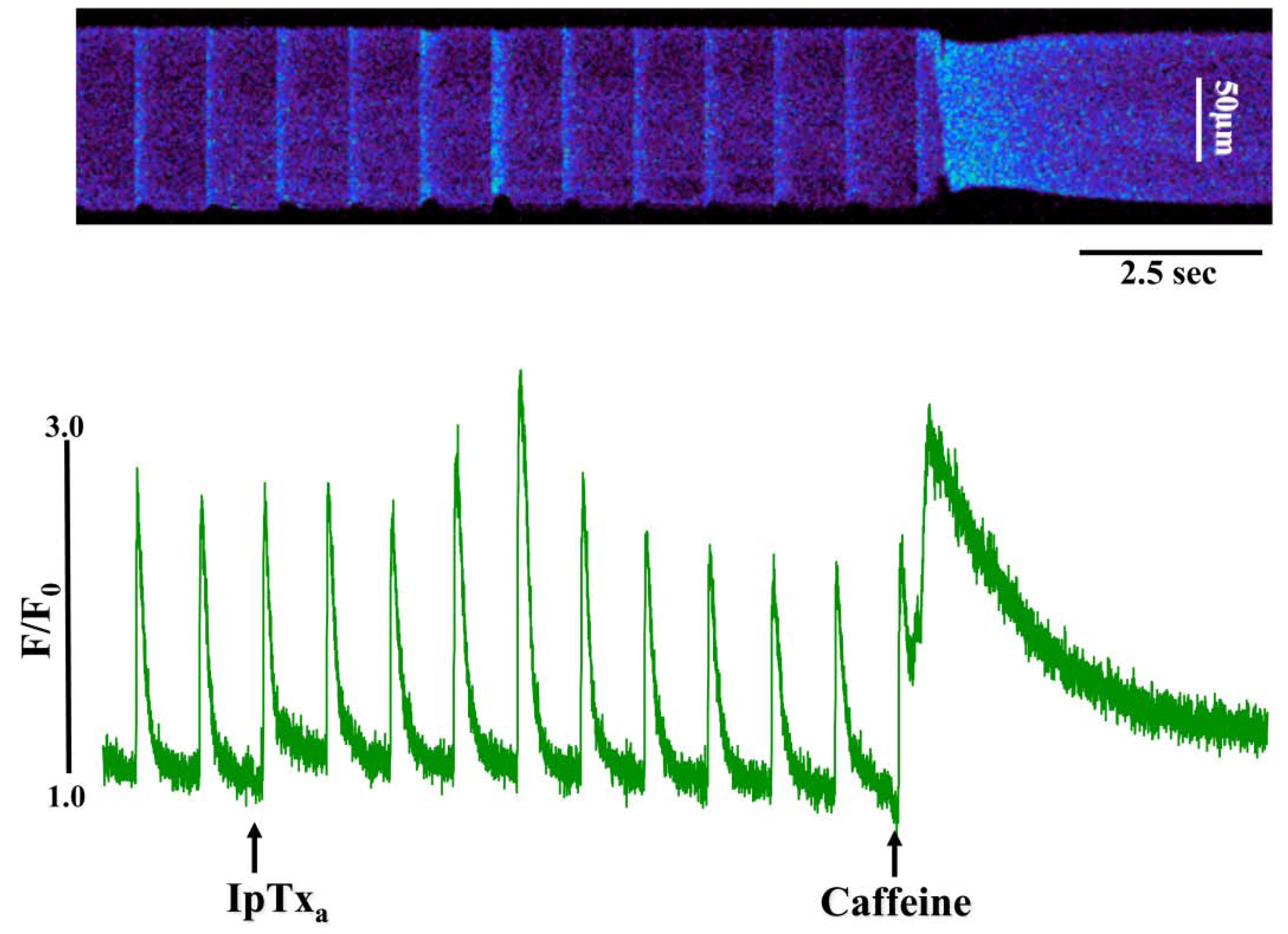 Changes in cytosolic [Ca2+] using the Ca2+-dependent fluorescent dye Fluo-3 AM. Fluo-3 AM was added to ventricular myocytes in Tyrodes solution (final concentration 10 μM) and incubated at room temperature for 30 minutes, after which the cells were washed and resuspended in Tyrodes solution. Fluorescence changes were monitored with a Zeiss META 5 line-scanning confocal microscope. Fluo-3 was excited at 488nm, and emissions were collected at 500-570 nm. Cells were perfused with normal Tyrodes and field-stimulated at 1 Hz. After recording control transients, synthetic, unmodified IpTxa was perfused at concentrations of 10 μM, 1 μM, and 100 nM for 10 seconds. To estimate the calcium load of the sarcoplasmic reticulum, we stopped stimulations and performed a rapid application of 10 mM caffeine to elicit complete Ca2+ release.