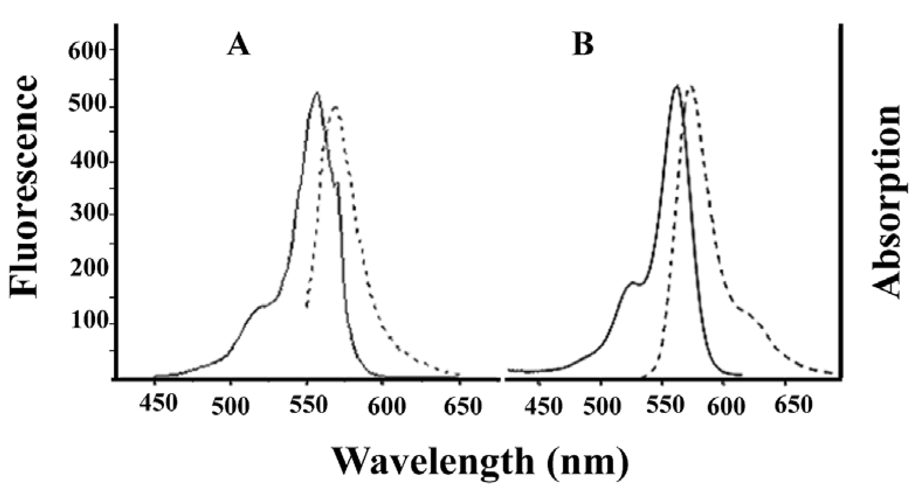 Absorption (solid line) and emission (broken line) spectra of Alexa-Fluor 546 (A) and Alexa-IpTxa (B). Unmodified IpTxa (not shown) lacks emission properties.