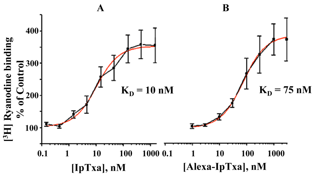 Dose-dependent activation of [3H]-ryanodine binding by native IpTxa and Alexa-IpTxa. Skeletal SR vesicles were incubated with 7 nM [3H]ryanodine in the absence (control 100%) and the indicated concentration of native (B) or modified IpTxa (A) The binding reaction was carried out for 90 min at 36˚C in medium containing 0.2 M KCl, 10 mM Na-HEPES (pH 7.2) and 10 μM CaCl2. Free and bound ligand were separated by rapid filtration as described in methods. Results are the mean ± S.D. of n=4 independent experiments.