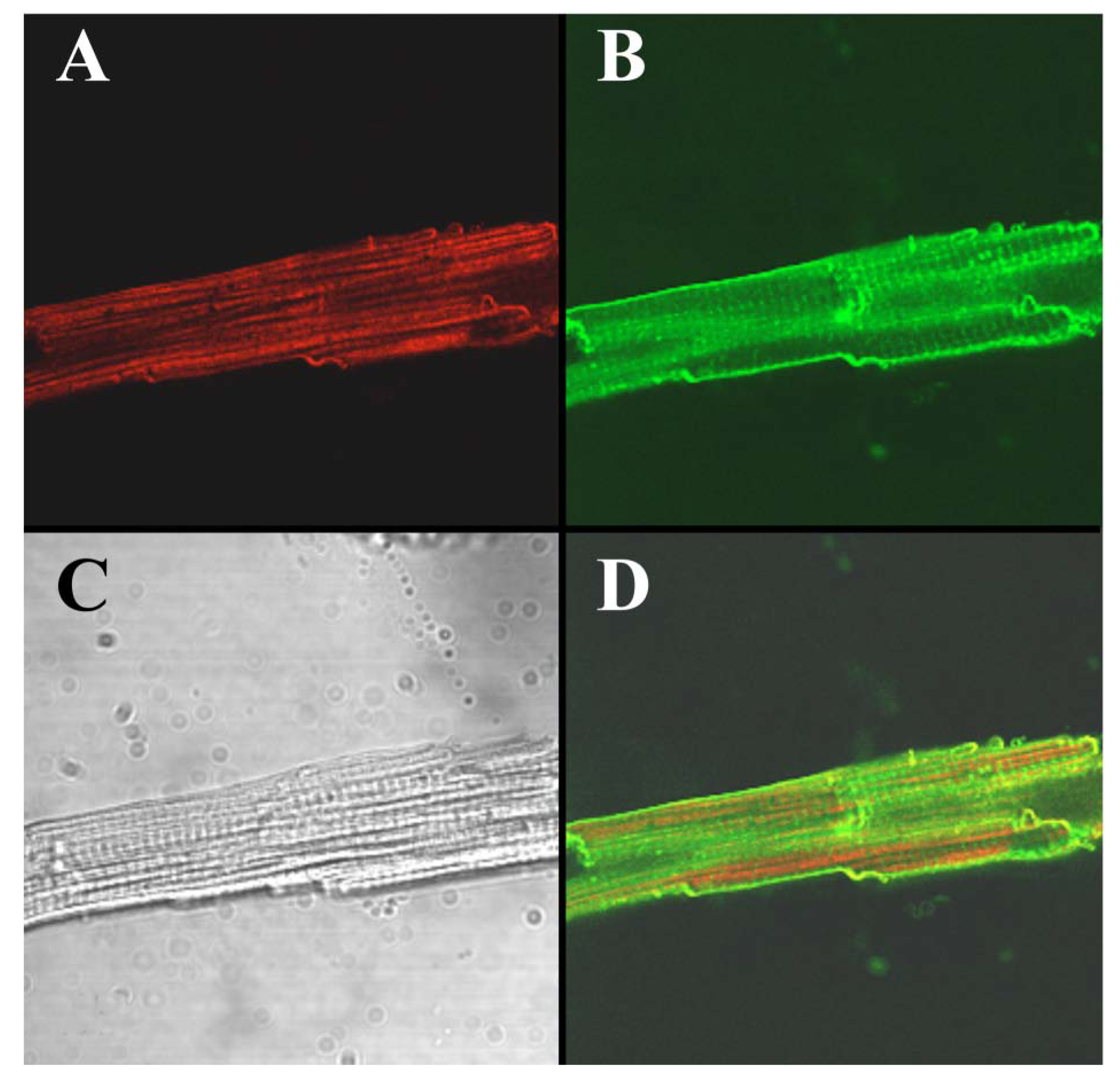 Alexa-IpTxa shows an intracellular localization in intact mouse ventricular myocytes. A, Alexa-IpTxa fluorescence; B, Alexa-Fluor-488 WGA; C, transmitted light image; D, merging of A and B images.