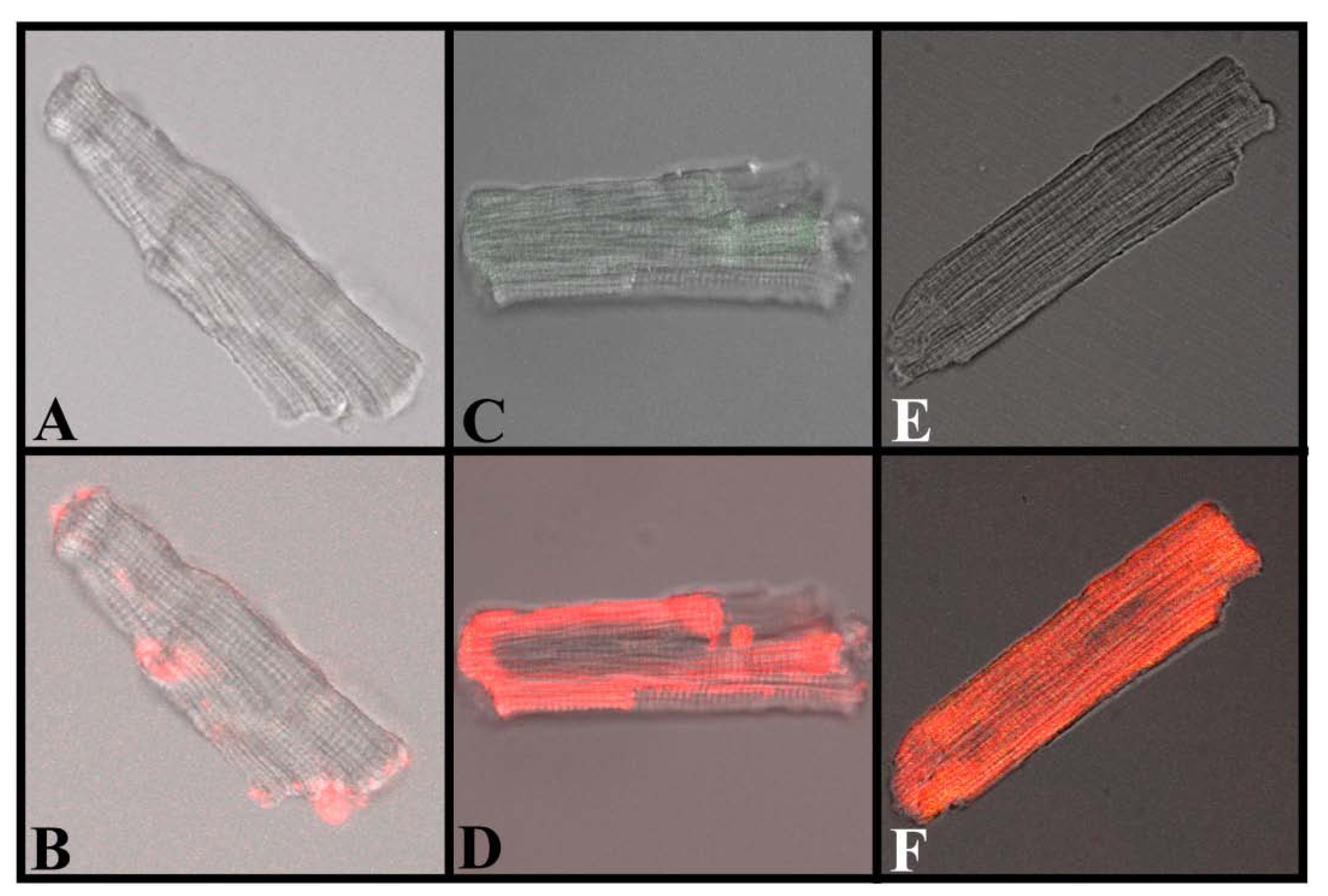 Translocation of IpTxa from external to intracellular compartments of intact mouse ventricular myocytes. All images represent the transmitted light image of the cardiomyocytes (C and B also show Fluo-3 fluorescence). A, C, and E were imaged at the beginning of the protocol, before the start of Alexa-IpTxa perfusion. B, Same cell as A, but after 10 minutes of Alexa-maleimide (1 μM) perfusion. D, Same cell as C, but after 10 minutes of Alexa-IpTxa (1 μM) perfusion. F, Same cell as E, but after 30 minutes of Alexa-IpTxa (1 μM) perfusion.
