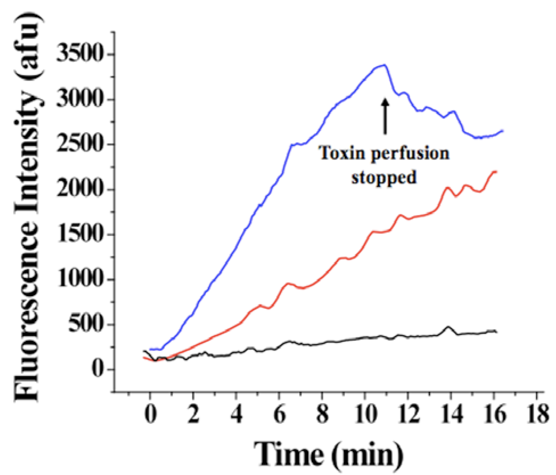 An increase in fluorescence intensity was observed for ROI-1 and ROI-3 <50 seconds after the beginning of perfusion with 1 μM Alexa-IpTxa (Figure 8). A slower and much smaller increase in intensity was observed for ROI-3 (even after 30 minutes), suggesting that translocation across the plasma membrane into the cytosol (rather than plasma membrane to cytosol, then from cytosol to nucleus) is the more favorable pathway. The fact that fluorescence intensity was greater in all cellular compartments than that observed in the bath is indicative that intact cells act as toxin concentrators, as previously observed for MCa [7]. In contrast, cells perfused with Alexa-maleimide show only labeling of the membrane.