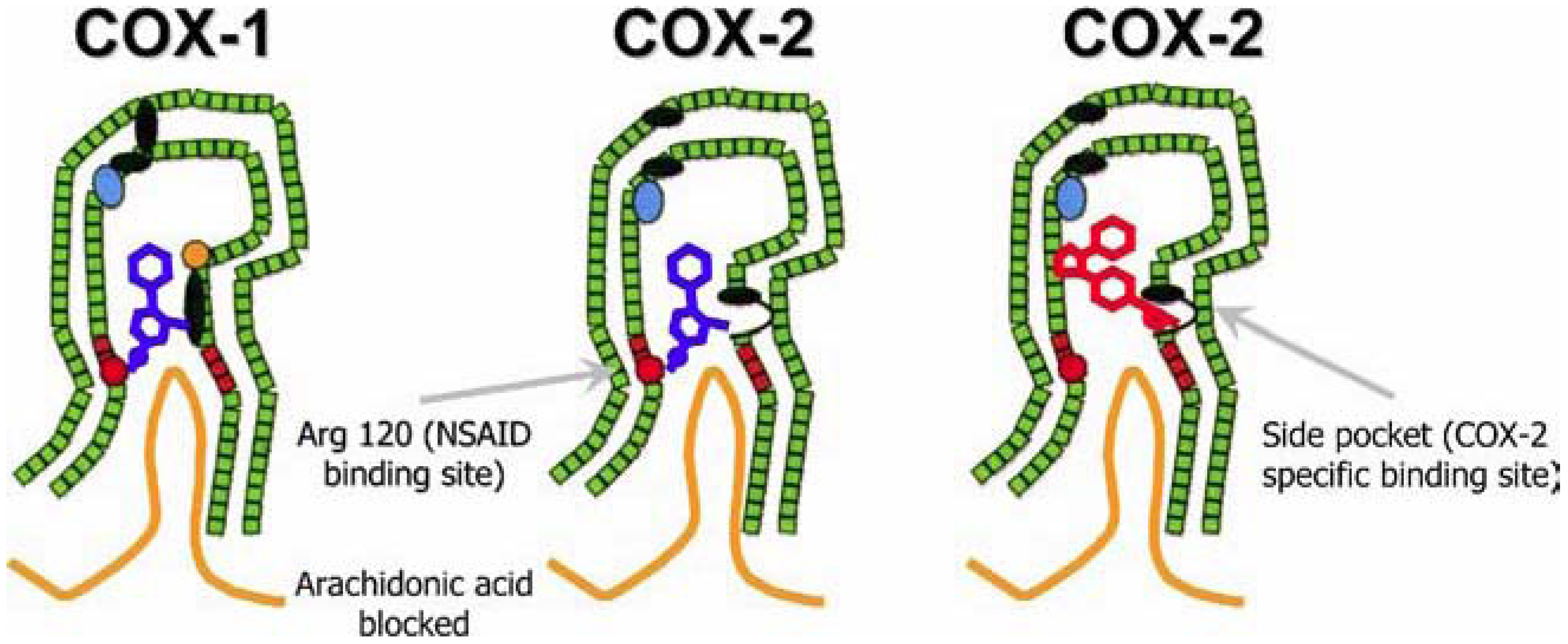 Left: schematic representation of the inhibition of COX-1 (large green figure) by a nonselective NSAID (central blue figure). The entrance channel to COX-1 is blocked by the NSAID. Binding and transformation of arachidonic acid (bottom yellow figure) within COX-1 is prevented. Middle: inhibition of COX-2 by a nonselective NSAID (central blue figure). Right: inhibition of COX-2 by COX-2 selective NSAID (central red figure). The COX-2 side pocket allows specific binding of the COX-2 selective NSAID’s rigid side extension. The entrance channel to COX-2 is blocked. The bulkier COX-2-selective NSAID will not fit into the narrower COX-1 entrance channel, allowing uninhibited access of arachidonic acid into COX-1. Adapted from Hawkey CJ [23].
