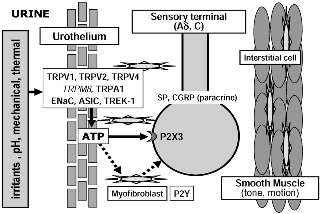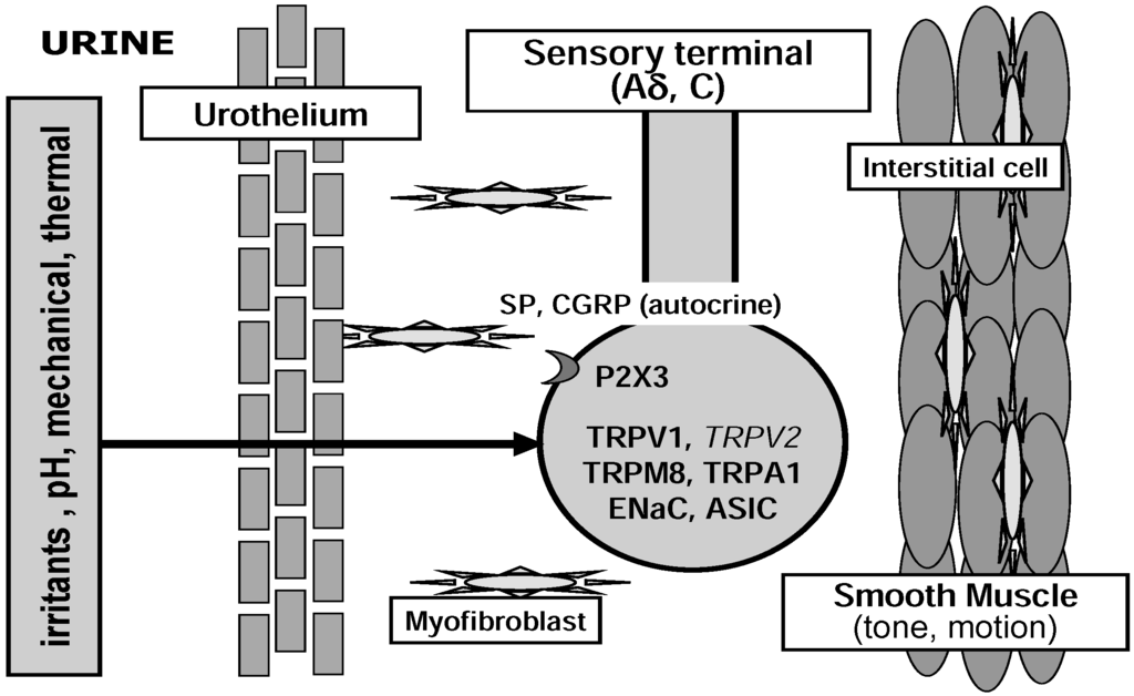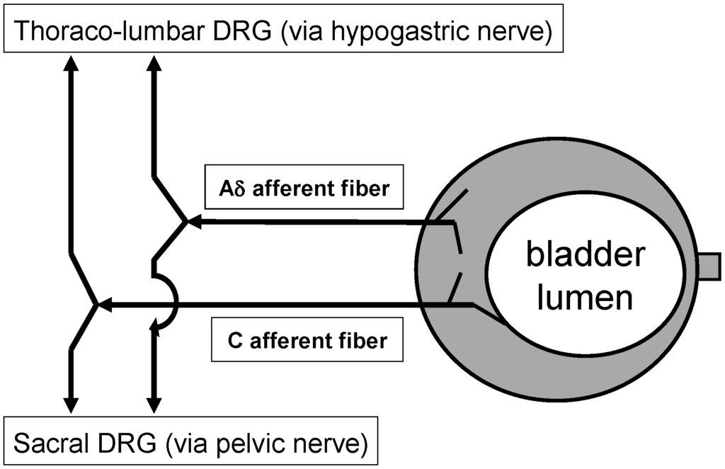Sensations from the bladder are conveyed by pelvic and hypogastric nerve afferent fibers (Figure 1) [1]. The pelvic nerves are the principal pathway for afferent input related to micturition. The mechanisms underlying the activation of bladder afferent pathway are not completely understood.
