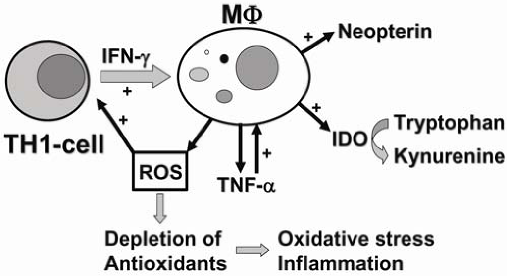 In the course of the adaptive immune response, activated T-helper (Th)1-type immune cells produce cytokines such as interleukin-2 or interferon-γ (IFN-γ). Pro-inflammatory cytokine IFN-γ stimulates several antiproliferative effector functions in monocyte-derived macrophages (MΦ), such as production of reactive oxygen species (ROS) and the activity of indoleamine-2,3-dioxygenase (IDO) and GTP-cyclohydrolase I, which are responsible for the conversion of tryptophan to kynurenine and the production of neopterin, respectively. Formation of ROS trigger redox-sensitive signal transduction cascades including the production of tumor necrosis factor-α (TNF-α), which enhances sensitivity of macrophages to pro-inflammatory IFN-γ. Continuous release of ROS may overwhelm the antioxidant capacity of cells, whereby oxidative stress and inflammation develop.