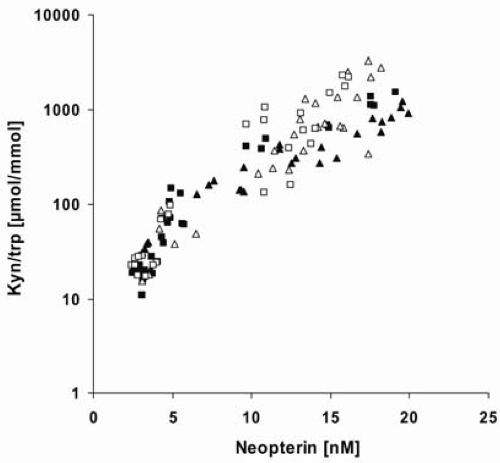 Associations between neopterin production and kynurenine to tryptophan ratio (Kyn/trp; shown in log scale) in phytohemagglutinin (PHA; open symbols) and concanavalin A(Con A; solid symbols)-stimulated peripheral blood mononuclear cells (PBMC) pretreated with Δ9-Tetrahydrocannabinol (THC; triangles) or cannabidiol (CBD; squares) at doses of 1-10 µg/mL. Neopterin production was positively associated with Kyn/trp in PHA-stimulated PBMC pretreated with THC (rs = 0.868; p < 0.001; n = 30) or CBD (rs = 0.909; p < 0.001; n = 30), as well as in Con A-stimulated PBMC pretreated with THC (rs = 0.962; p < 0.001; n = 26) or CBD (rs = 0.909; p < 0.001; n = 30). Tryptophan and kynurenine concentrations were measured by high-performance liquid chromatography (HPLC) [20], and concentrations of neopterin by a commercially available enzyme linked immunosorbent assay (BRAHMS, Hennigsdorf, Germany). Non-parametric correlations were calculated using Spearman’s rank test.