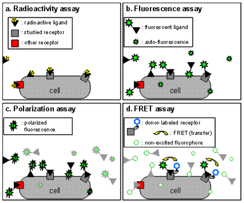 Fluorescence polarization assays, like the ones previously mentioned, can be performed on receptors expressed either in native tissues or in transfected cells. Moreover, these assays can be performed in homogeneous conditions: fluorescent ligands are simply added to the biological sample and no washing steps are required to measure fluorescence polarization, making it very simple to adapt for high-throughput screening and allowing straightforward kinetics studies [6]. However, the affinity of the fluorescent ligands should be high enough to bind to the receptor at low concentrations and therefore get a bound ligand-to-free ligand ratio high enough to give a significant fluorescent polarization signal.