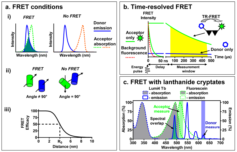 To overcome this challenge, binding assays based on fluorescence resonance energy transfer (FRET) have been developed (Figure 1d). Briefly, FRET occurs between a ‘donor’ fluorophore and an ‘acceptor’ fluorophore, which can be carried either by the ligand or by the receptor. Three parameters condition FRET efficacy [13] (Figure 2a): (i) the two fluorophores have to exhibit energy compatibility; (ii) the dipole moments of the fluorophores have to be correctly oriented, the FRET being null when dipoles are perpendicular and maximum when they are parallel; and (iii) the fluorophores have to be close enough, usually less than 10 nm apart.