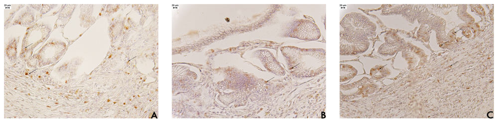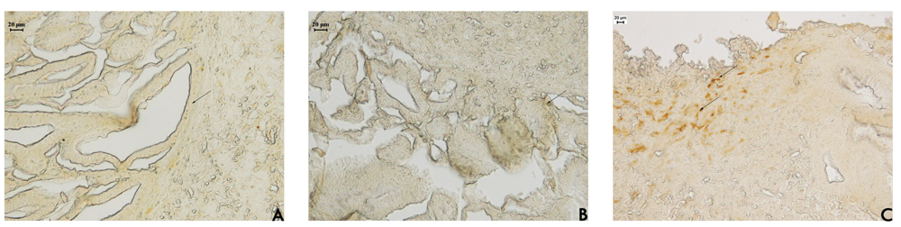 The positive PCNA immunohistochemical labeling in stomach tissue from EAF-treated rats appeared mainly at the base of the glands (Figure 3). This result occurs because stem cells re-organise at the base of glands, indicating the unidirectionality of cell proliferation, which is different in normal regions that have a bi-directional proliferation [20]. We also assessed the number of neutrophils in the region under the regenerative mucosa in stomach tissue from the three groups (Table 3). The cell counts showed a significant increase (p < 0.05) in neutrophils in regions under the regenerative mucosa for EAF (15.39 ± 1.52 cells/mm2) compared with the saline (6.40 ± 1.69 cells/mm2) or cimetidine (11.40 ± 0.93 cells/mm2) groups.