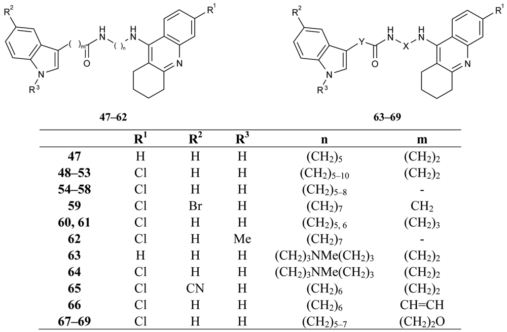 These derivatives are able to bind simultaneously to both sites of the enzyme. A propidium competition assay confirms the interaction of the compounds 35–46 at the PAS of AChE. Compounds 40 (IC50 = 2.8 nM), and 46 (IC50 = 2.4 nM) were found to be the most potent AChEI, while tether length for the linker seemed to be 9 (compound 46) or 10 (compound 40). The most active AChEIs discovered to date are represented by a large series of novel tacrine-indole heteroligands 47–69 synthesized by Muñoz-Ruiz [] and his colleagues (Figure 14). The dual binding mode of the compounds under study takes place at both the catalytic and peripheral sites of the enzyme.
