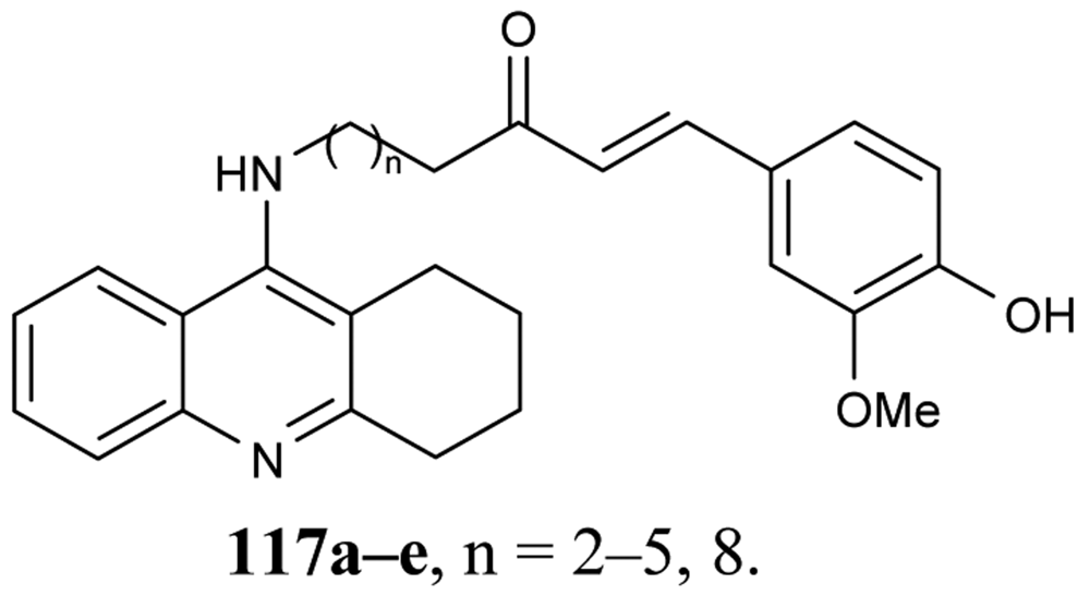 A new series of tacrine-ferulic acid hybrids 117a–e with antioxidant effects have been synthesized and tested as multipotent anti-Alzheimer drug analogs by Fang et al. [] (Figure 21). Among all of the tested hybrids 117a–e, ligand 117d showed a greater activity toward AChE/BuChE (IC50 = 4.4 nM, 6.7 nM, resp.) in comparison to tacrine. The optimal differences between the tacrine-like heterocycle and the ferulic acid moiety were 6–7 atoms long.