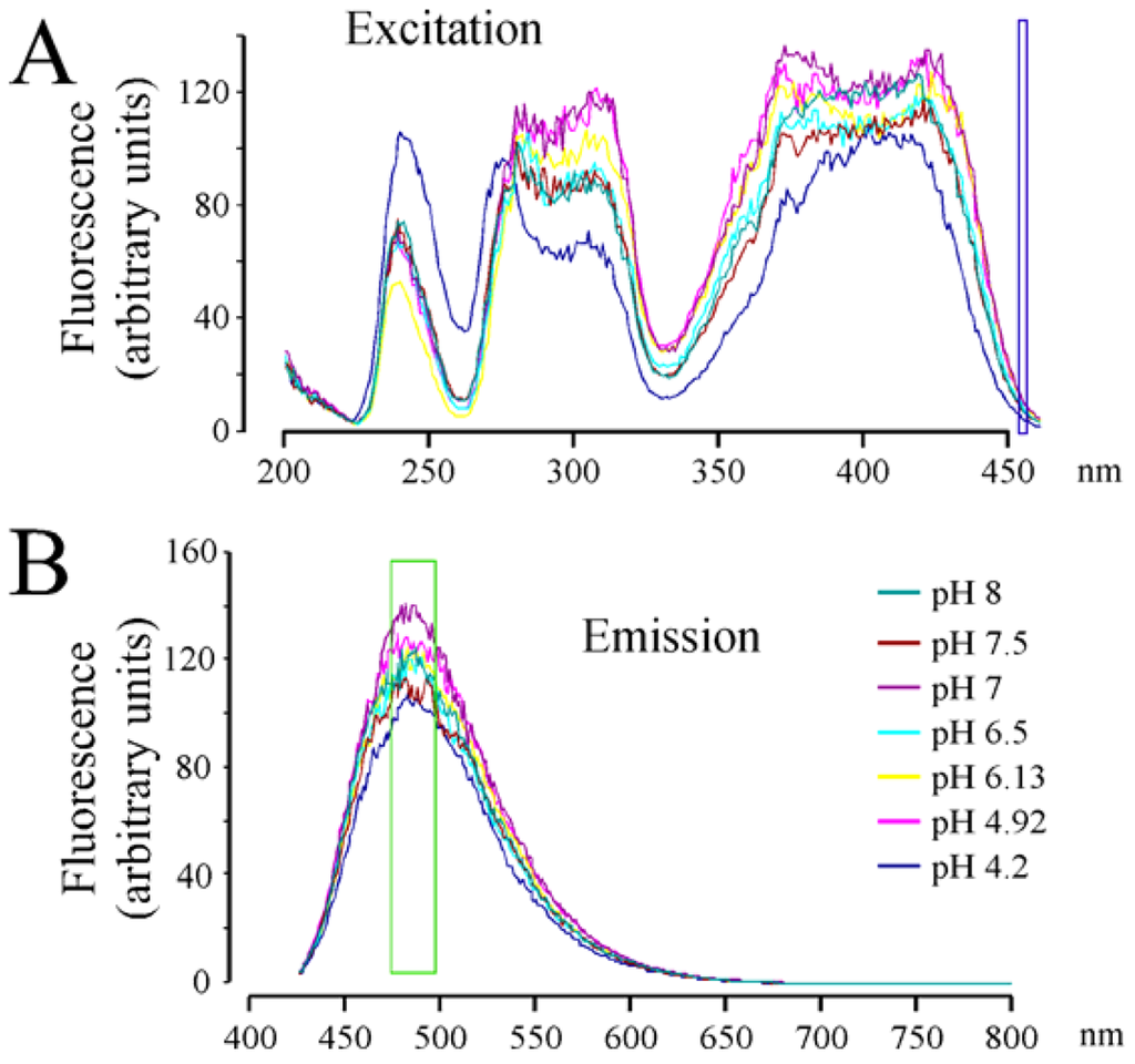 When the fluorescent spectrum of RCTM-3 was studied (Figure 1), three peaks were evident in the excitation spectra and one in the emission spectra, characteristics that made it ideal to use in living cells that do not autofluorescence when excited at 425 nm. We also explored the pH dependence of this fluorescence as secretory vesicles have a pH of about 5.5 [8]. However, we only observed important changes in the excitation spectra of RCTM-3 at very acid pHs (e.g., pH 4.2), which is unlikely to be reached within vesicles (Figure 1). Nevertheless, the strong fluorescence of this compound means that even the spectral position of our laser line can be used (460 nm, blue square in Figure 1A). Despite these unfavorable conditions, the accumulation of RCTM-3 can be monitored by TIRF microscopy.