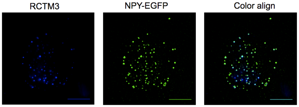 To reveal the presence of β-Bs within subcellular structures such as PC12 secretory vesicles, we performed experiments using total internal reflection fluorescence microscopy (TIRFM). PC12 cells were transfected with a NPY-EGFP plasmid and 48 h later they were incubated with RCTM-3 (10 μM) for 10 min. Double labeled structures were typically seen, suggesting the co-localization of EGFP (green) and RCTM-3 (blue: Figure 3).