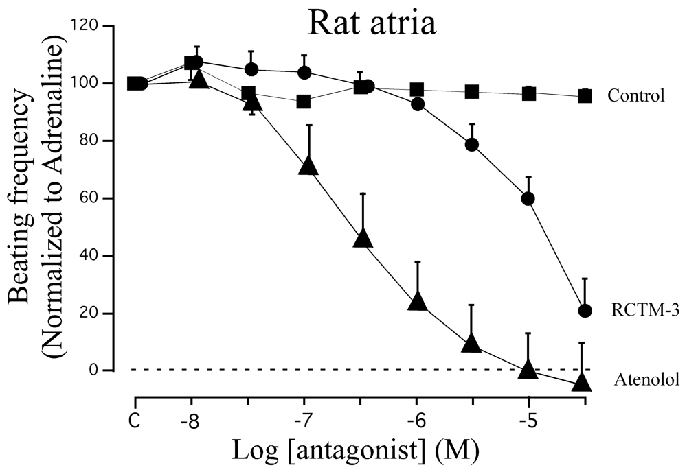 β-blocker activity has classically been assayed in isolated rat atria. Although this preparation beats spontaneously at ≈200 b.p.m., β-adrenergic agonists like adrenaline can increase the beating frequency to about 300 b.p.m. We demonstrated that adrenaline (300 nM) can maintain this frequency of beating for at least 20 min, sufficient time to test eight cumulative concentrations of β-Bs (10−8−3 × 10−5 M: Figure 3). When compared with the β1 cardioselective blocker atenolol, RCTM-3 showed moderate blocking activity (IC50 14.1 vs. 0.28 μM) but no action on rat aorta rings pre-contracted with phenylephrine (Table 1). This response is typical of β-Bs that lack α activity, usually the initial test in screening procedures.
