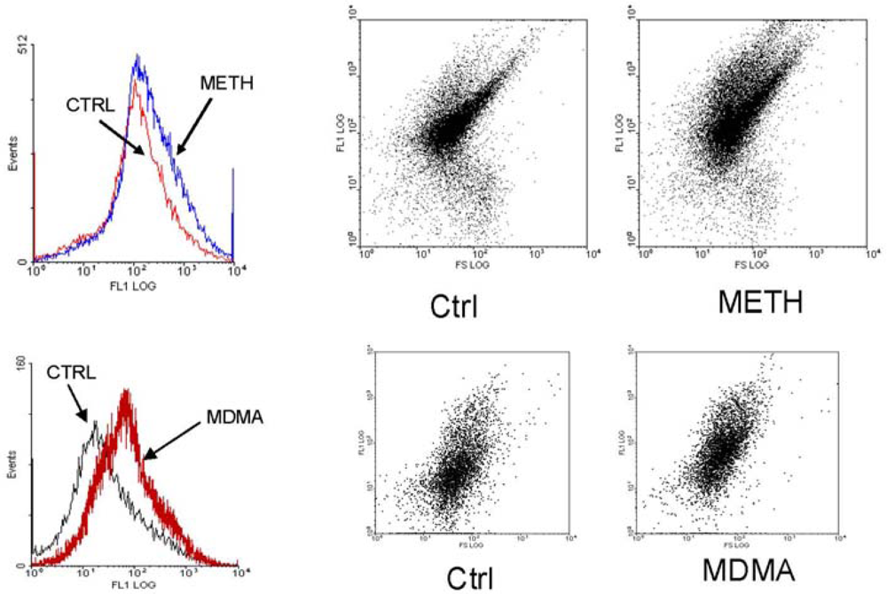 The effect of METH and MDMA addition on ROS production was studied using a preparation of semi-purified rat striatal synaptosomes loaded with the ROS-sensitive fluorescent probe 2′,7′-dichlorofluorescin diacetate (DCFH-DA) and a flow cytometer equipped with an argon laser as the measurement instrument [,].