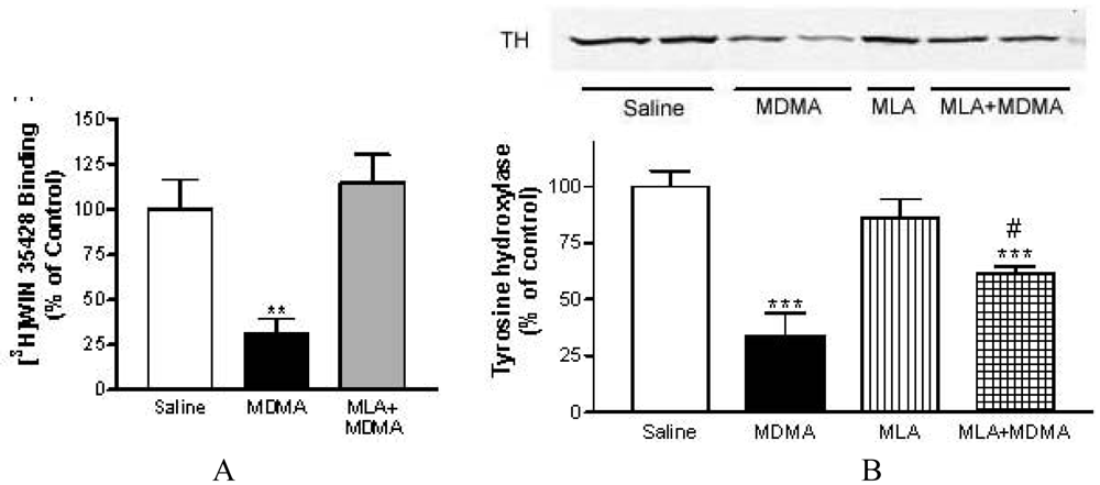 Similar results were obtained with MDMA and MLA (Figure 5). Surprisingly, MLA did not prevent the loss in [3H]paroxetine binding sites indicating that its neuroprotective effect in mice is selective for dopaminergic terminals []. This selective dopaminergic neuroprotection of MLA has been corroborated more recently by other researchers [].