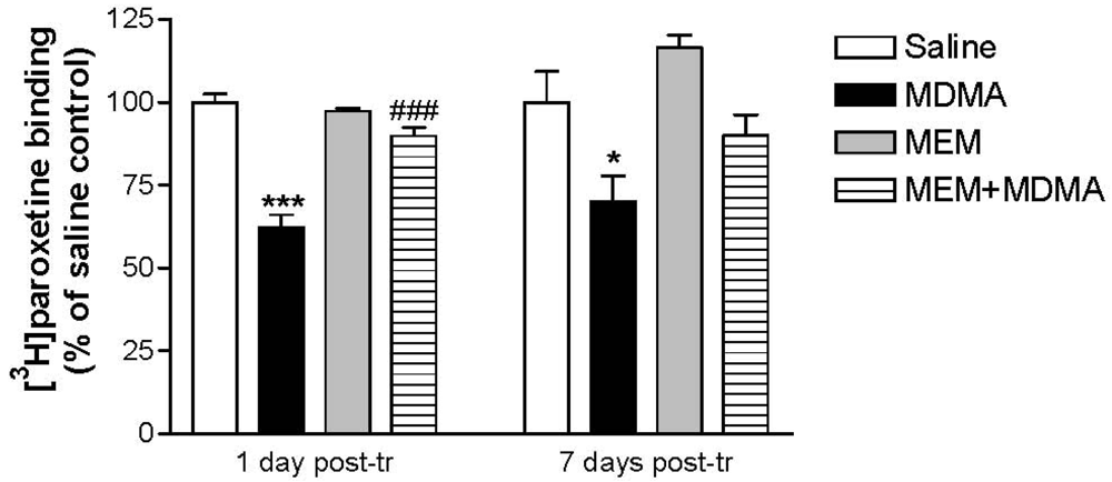 A significant decrease in the density of serotonin transporters (assessed by [3H]paroxetine binding) was observed in the hippocampus and frontal cortex of MDMA-treated rats killed 7 days post-treatment, although such a serotonergic injury was already apparent 24 h post-treatment []. In both cases, MEM significantly prevented the loss of binding sites, suggesting a neuroprotective effect on serotonergic terminals (Figure 6). MEM also prevented the delayed glial activation that was detected as an increase in [3H]PK 11195 binding in the animals killed 7 days after treatment, supporting the protective effect.