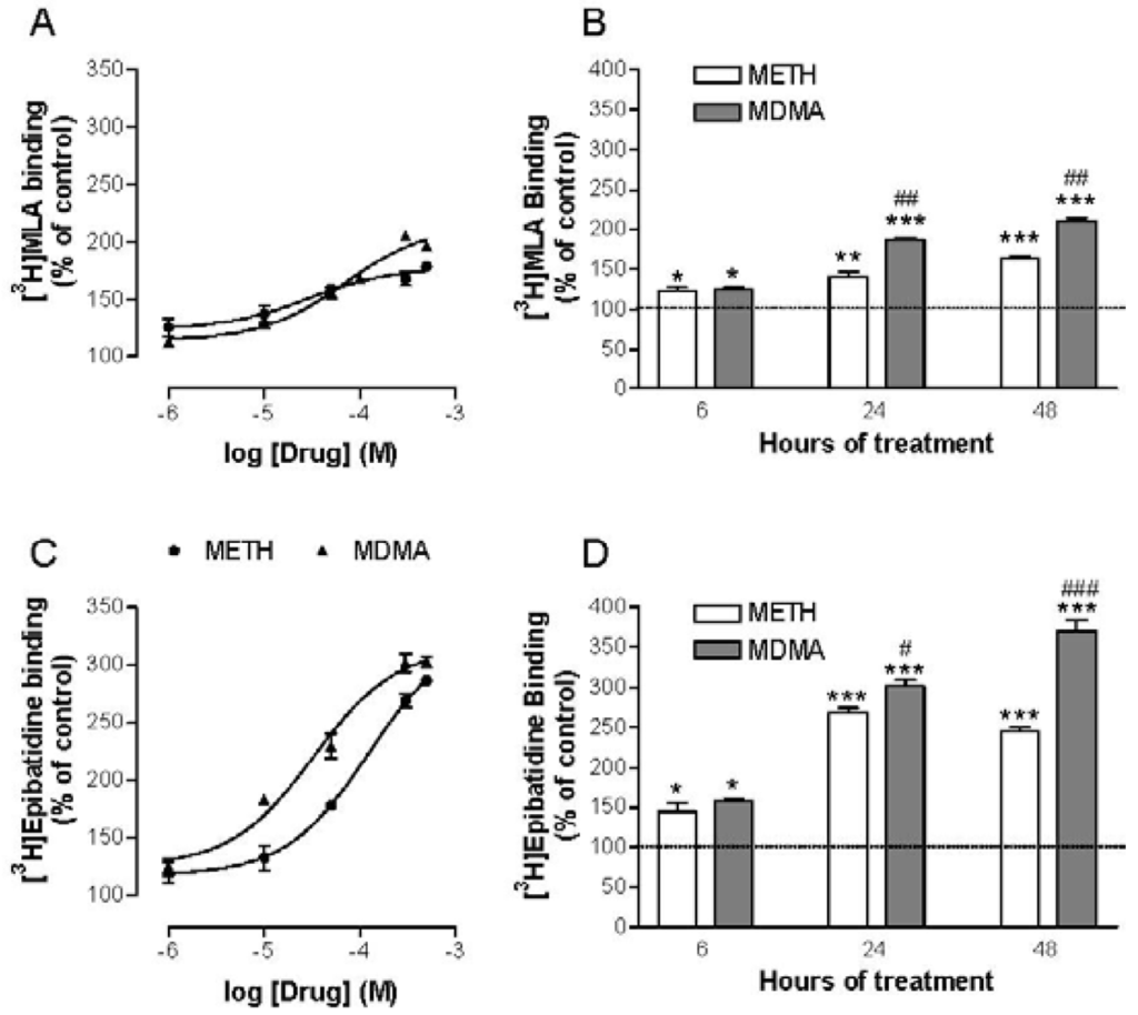 Regardless of the mechanism, according to competition experiments demonstrating the affinity of METH and MDMA for nAChR, it could be hypothesized that the up-regulation of nAChR induced by these drugs would follow a similar mechanism than that of nicotine: binding to immature forms of the receptor inhibiting their degradation, promoting their migration to the plasma membrane or stabilizing the high-affinity state.